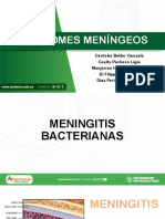 Inmunocomprometidos: Ampicilina + Ceftazidima + Vancomicina + Aciclovir DVP, Traumatismo o neurociruga: Vancomicina + Ceftazidima. Corticoesteroides (Dexametasona 10 mg IV cada 6 hrs x 4 das, de preferencia iniciar al mismo tiempo que Antibitico) Profilaxis: Rifampicina 600 mg VO 2 veces al da por 2 das, o Ciprofloxacino 500 mg VO 1X1, o Ceftriaxona 250 mg IM para contactos de pacientes con M. Meningococcica. BIBLIOGRAFA: o D Duarte. Infectologa y Medicina tropical. Principles and Practices of Infectious Diseases Mandell, Bennett, Dolin Sexta edicin (2005). Clinical Infectious Diseases, New England Journal of Medicine. o Eskola J, Takala AK, Kela E, Pekkanen E, Kalliokoski R, Leinonen M. Epidemiology of invasive pneumococcal infections in children. JAMA 1992;268:3323-7. o M P Ruiz. Infecciones agudas del sistema nervioso central (meningitis y encefalitis) virales y bacterianas de origen autctono. Enferm Infecc Microbiol Clin. 2008;26 Supl 9:8-14. o X. Sez-Llorens Patognesis de la meningitis bacteriana. Implicaciones teraputicas. An Esp Pediatr 2002;57(Supl 1):14-8. o F. Asensi Botet. Tratamiento de las meningitis bacterianas, An Esp Pediatr 2002;57(Supl 1):19-23. o F. de Juan Martn. Impacto de la inmunizacin frente a las enfermedades invasoras por neumococo: vacuna neumoccica conjugada. An Esp Pediatr 2002;57(Supl 1):24-30.