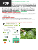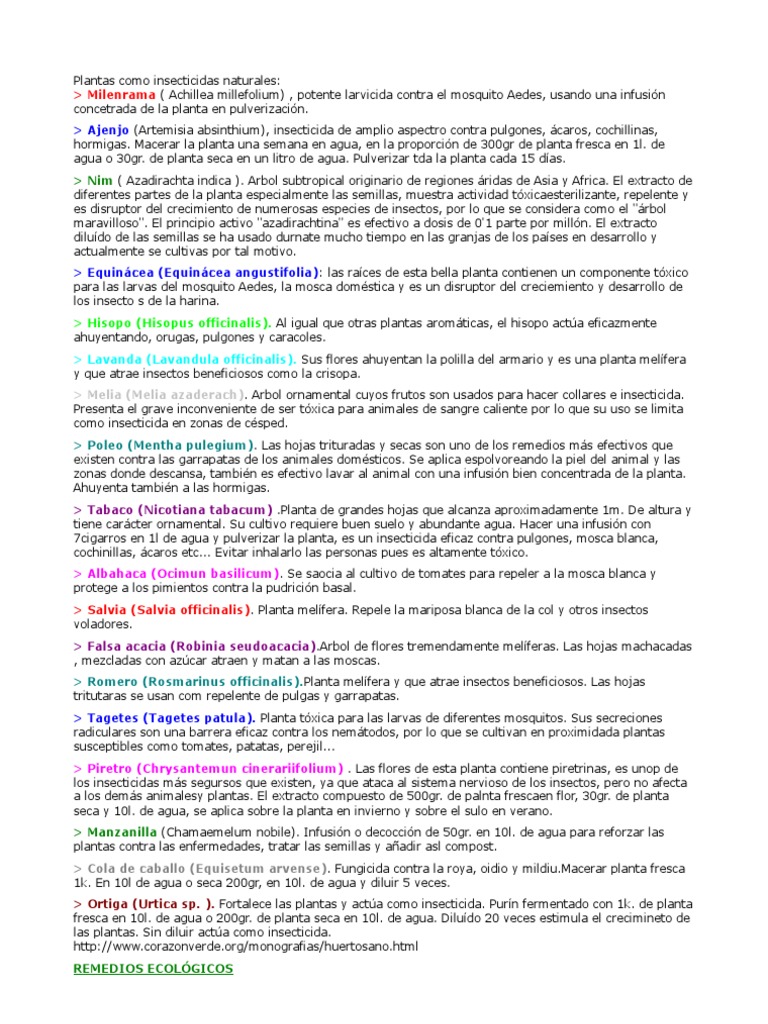 infusin concetrada de la planta en pulverizacin. > Ajenjo (Artemisia absinthium), insecticida de amplio aspectro contra pulgones, caros, cochillinas, hormigas. Macerar la planta una semana en agua, en la proporcin de 300gr de planta fresca en 1l. de agua o 30gr. de planta seca en un litro de agua. Pulverizar tda la planta cada 15 das. > Nim ( Azadirachta indica ). Arbol subtropical originario de regiones ridas de Asia y Africa. El extracto de diferentes partes de la planta especialmente las semillas, muestra actividad txicaesterilizante, repelente y es disruptor del crecimiento de numerosas especies de insectos, por lo que se considera como el "rbol maravilloso". El principio activo "azadirachtina" es efectivo a dosis de 0'1 parte por milln. El extracto diludo de las semillas se ha usado durnate mucho tiempo en las granjas de los pases en desarrollo y actualmente se cultivas por tal motivo. > Equincea (Equincea angustifolia): las races de esta bella planta contienen un componente txico para las larvas del mosquito Aedes, la mosca domstica y es un disruptor del creciemiento y desarrollo de los insecto s de la harina. > Hisopo (Hisopus officinalis). Al igual que otras plantas aromticas, el hisopo acta eficazmente ahuyentando, orugas, pulgones y caracoles. > Lavanda (Lavandula officinalis). Sus flores ahuyentan la polilla del armario y es una planta melfera y que atrae insectos beneficiosos como la crisopa. > Melia (Melia azaderach). Arbol ornamental cuyos frutos son usados para hacer collares e insecticida. Presenta el grave inconveniente de ser txica para animales de sangre caliente por lo que su uso se limita como insecticida en zonas de csped. > Poleo (Mentha pulegium). Las hojas trituradas y secas son uno de los remedios ms efectivos que existen contra las garrapatas de los animales domsticos. Se aplica espolvoreando la piel del animal y las zonas donde descansa, tambin es efectivo lavar al animal con una infusin bien concentrada de la planta. Ahuyenta tambin a las hormigas. > Tabaco (Nicotiana tabacum) .Planta de grandes hojas que alcanza aproximadamente 1m. De altura y tiene carcter ornamental. Su cultivo requiere buen suelo y abundante agua. Hacer una infusin con 7cigarros en 1l de agua y pulverizar la planta, es un insecticida eficaz contra pulgones, mosca blanca, cochinillas, caros etc... Evitar inhalarlo las personas pues es altamente txico. > Albahaca (Ocimun basilicum). Se saocia al cultivo de tomates para repeler a la mosca blanca y protege a los pimientos contra la pudricin basal. > Salvia (Salvia officinalis). Planta melfera. Repele la mariposa blanca de la col y otros insectos voladores. > Falsa acacia (Robinia seudoacacia).Arbol de flores tremendamente melferas. Las hojas machacadas , mezcladas con azcar atraen y matan a las moscas. > Romero (Rosmarinus officinalis).Planta melfera y que atrae insectos beneficiosos. Las hojas tritutaras se usan com repelente de pulgas y garrapatas. > Tagetes (Tagetes patula). Planta txica para las larvas de diferentes mosquitos. Sus secreciones radiculares son una barrera eficaz contra los nemtodos, por lo que se cultivan en proximidada plantas susceptibles como tomates, patatas, perejil... > Piretro (Chrysantemun cinerariifolium) . Las flores de esta planta contiene piretrinas, es unop de los insecticidas ms segursos que existen, ya que ataca al sistema nervioso de los insectos, pero no afecta a los dems animalesy plantas. El extracto compuesto de 500gr. de palnta frescaen flor, 30gr. de planta seca y 10l. de agua, se aplica sobre la planta en invierno y sobre el sulo en verano. > Manzanilla (Chamaemelum nobile). Infusin o decoccin de 50gr. en 10l. de agua para reforzar las plantas contra las enfermedades, tratar las semillas y aadir asl compost. > Cola de caballo (Equisetum arvense). Fungicida contra la roya, oidio y mildiu.Macerar planta fresca 1k. En 10l de agua o seca 200gr, en 10l. de agua y diluir 5 veces. > Ortiga (Urtica sp. ). Fortalece las plantas y acta como insecticida. Purn fermentado con 1k. de planta fresca en 10l. de agua o 200gr. de planta seca en 10l. de agua. Diludo 20 veces estimula el crecimineto de las plantas. Sin diluir acta como insecticida. http://www.corazonverde.org/monografias/huertosano.html REMEDIOS ECOLGICOS