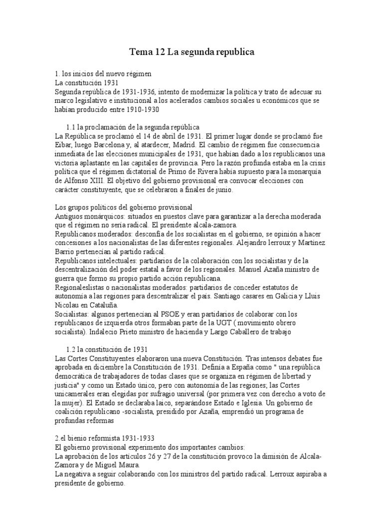1. los inicios del nuevo rgimen La constitucin 1931 Segunda repblica de 1931-1936, intento de modernizar la poltica y trato de adecuar su marco legislativo e institucional a los acelerados cambios sociales u econmicos que se haban producido entre 1910-1930 1.1 la proclamacin de la segunda repblica La Repblica se proclam el 14 de abril de 1931. El primer lugar donde se proclam fue Eibar, luego Barcelona y, al atardecer, Madrid. El cambio de rgimen fue consecuencia inmediata de las elecciones municipales de 1931, que haban dado a los republicanos una victoria aplastante en las capitales de provincia. Pero la razn profunda estaba en la crisis poltica que el rgimen dictatorial de Primo de Rivera haba supuesto para la monarqua de Alfonso XIII. El objetivo del gobierno provisional era convocar elecciones con carcter constituyente, que se celebraron a finales de junio. Los grupos polticos del gobierno provisional Antiguos monrquicos: situados en puestos clave para garantizar a la derecha moderada que el rgimen no sera radical. El presidente alcala-zamora. Republicanos moderados: desconfa de los socialistas en el gobierno, se opinin a hacer concesiones a los nacionalistas de las diferentes regionales. Alejandro lerroux y Martnez Barrio pertenecan al partido radical. Republicanos intelectuales: partidarios de la colaboracin con los socialistas y de la descentralizacin del poder estatal a favor de los regionales. Manuel Azaa ministro de guerra que formo su propio partido accin republicana. Regionaleslistas o nacionalistas moderados: partidarios de conceder estatutos de autonoma a las regiones para descentralizar el pas. Santiago casares en Galicia y Lluis Nicolau en Catalua. Socialistas: algunos pertenecan al PSOE y eran partidarios de colaborar con los republicanos de izquierda otros formaban parte de la UGT ( movimiento obrero socialista). Indalecio Prieto ministro de hacienda y Largo Caballero de trabajo 1.2 la constitucin de 1931 Las Cortes Constituyentes elaboraron una nueva Constitucin. Tras intensos debates fue aprobada en diciembre la Constitucin de 1931. Defina a Espaa como " una repblica democrtica de trabajadores de todas clases que se organiza en rgimen de libertad y justicia" y como un Estado nico, pero con autonoma de las regiones; las Cortes unicamerales eran elegidas por sufragio universal (por primera vez con derecho a voto de la mujer). El Estado se declaraba laico, separndose Estado e Iglesia. Un gobierno de coalicin republicano -socialista, presidido por Azaa, emprendi un programa de profundas reformas [Link] bienio reformista 1931-1933 El gobierno provisional experimento dos importantes cambios: La aprobacin de los artculos 26 y 27 de la constitucin provoco la dimisin de AlcalaZamora y de Miguel Maura. La negativa a seguir colaborando con los ministros del partido radical. Lerroux aspiraba a presidente de gobierno.