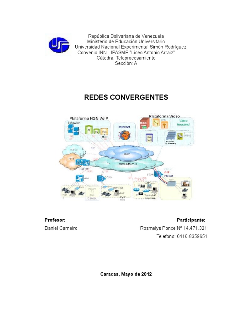 INTRODUCCIN Podemos decir, que las redes convergentes o redes de multiservicio hacen referencia a la integracin de los servicios de voz, datos y vdeo sobre una sola red basada en IP como protocolo de nivel de red. En este artculo se presenta la integracin de servicios de voz sobre redes IP (VoIP) como ejemplo de red convergente. La arquitectura de esta red est constituida bsicamente, por el media gateway, el controlador de media gateway, el gateway de sealizacin y el gatekeeper. Las redes de convergencia han tenido y tendrn an dificultades tcnicas qu superar ya que los distintos servicios por ofrecer tienen diferentes caractersticas y requerimientos de red, por tanto es importante hablar aqu de ingeniera de trfico y mecanismos que garanticen calidades de servicio.