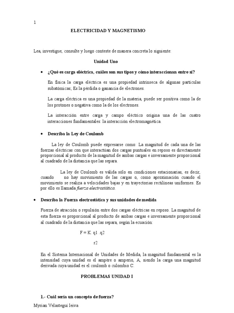 Lea, investigue, consulte y luego conteste de manera concreta lo siguiente: Unidad Uno Qu es carga elctrica, cules son sus tipos y cmo interaccionan entre s? En fsica la carga elctrica es una propiedad intrnseca de algunas partculas subatmicas; Es la prdida o ganancia de electrones. La carga elctrica es una propiedad de la materia, puede ser positiva como la de los protones o negativa como la de los electrones. La interaccin entre carga y campo elctrico origina una de las cuatro interacciones fundamentales: la interaccin electromagntica. Describa la Ley de Coulomb