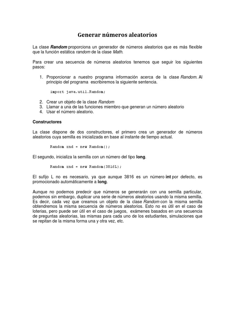 genera un nmero aleatorio de tipo double entre 0.0 y 1.0, aunque siempre menor que 1.0 Casi siempre usaremos esta ltima versin. Por ejemplo, para generar una secuencia de 10 nmeros aleatorios entre 0.0 y 1.0 escribimos