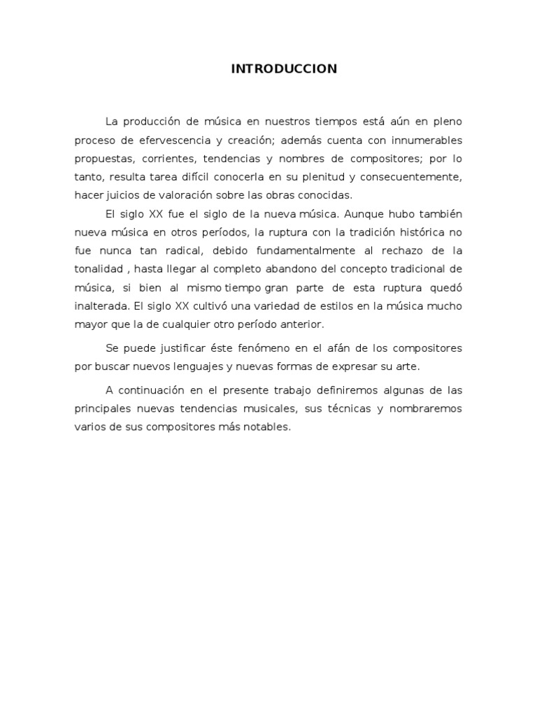 La produccin de msica en nuestros tiempos est an en pleno proceso de efervescencia y creacin; adems cuenta con innumerables propuestas, corrientes, tendencias y nombres de compositores; por lo tanto, resulta tarea difcil conocerla en su plenitud y consecuentemente, hacer juicios de valoracin sobre las obras conocidas. El siglo XX fue el siglo de la nueva msica. Aunque hubo tambin nueva msica en otros perodos, la ruptura con la tradicin histrica no fue nunca tan radical, debido fundamentalmente al rechazo de la tonalidad , hasta llegar al completo abandono del concepto tradicional de msica, si bien al mismo tiempo gran parte de esta ruptura qued inalterada. El siglo XX cultiv una variedad de estilos en la msica mucho mayor que la de cualquier otro perodo anterior. Se puede justificar ste fenmeno en el afn de los compositores por buscar nuevos lenguajes y nuevas formas de expresar su arte. A continuacin en el presente trabajo definiremos algunas de las principales nuevas tendencias musicales, sus tcnicas y nombraremos varios de sus compositores ms notables.