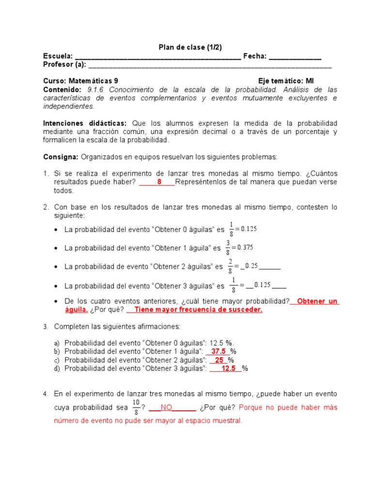 Plan de clase (2/2) Escuela: _________________________________________ Fecha: _____________ Profesor (a): ____________________________________________________________ Curso: Matemticas 9 Eje temtico: MI Contenido: 9.1.6 Conocimiento de la escala de la probabilidad. Anlisis de las caractersticas de eventos complementarios y eventos mutuamente excluyentes e independientes. Intenciones didcticas: Que los alumnos identifiquen las caractersticas de eventos complementarios, mutuamente excluyentes e independientes. Consigna: Organizados en equipos resuelvan los siguientes problemas: 1. Analicen el siguiente experimento e identifiquen las caractersticas de los eventos B y C y M y N. Experimento: Lanzar un dado. Espacio muestral: E = {1, 2, 3, 4, 5, 6} Evento B: Cae un nmero menor que tres. Evento C: Cae un nmero mayor que cuatro. Caractersticas de los eventos B y C: ocurrencia. ambos tienen B = {1, 2} C = {5, 6} la misma probabilidad de
