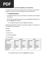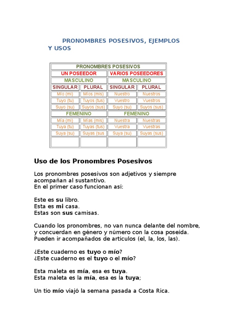 Los pronombres posesivos son adjetivos y siempre acompaan al sustantivo. En el primer caso funcionan as: Este es su libro. Esta es mi casa. Estas son sus camisas. Cuando los pronombres, no van nunca delante del nombre, y concuerdan en gnero y nmero con la cosa poseda. Pueden ir acompaados de artculos (el, la, los, las). Este cuaderno es tuyo o mo? Este cuaderno es el tuyo o el mo? Esta maleta es ma, esa es tuya. Esta maleta es la ma, esa es la tuya; Un to mo viaj la semana pasada a Costa Rica.