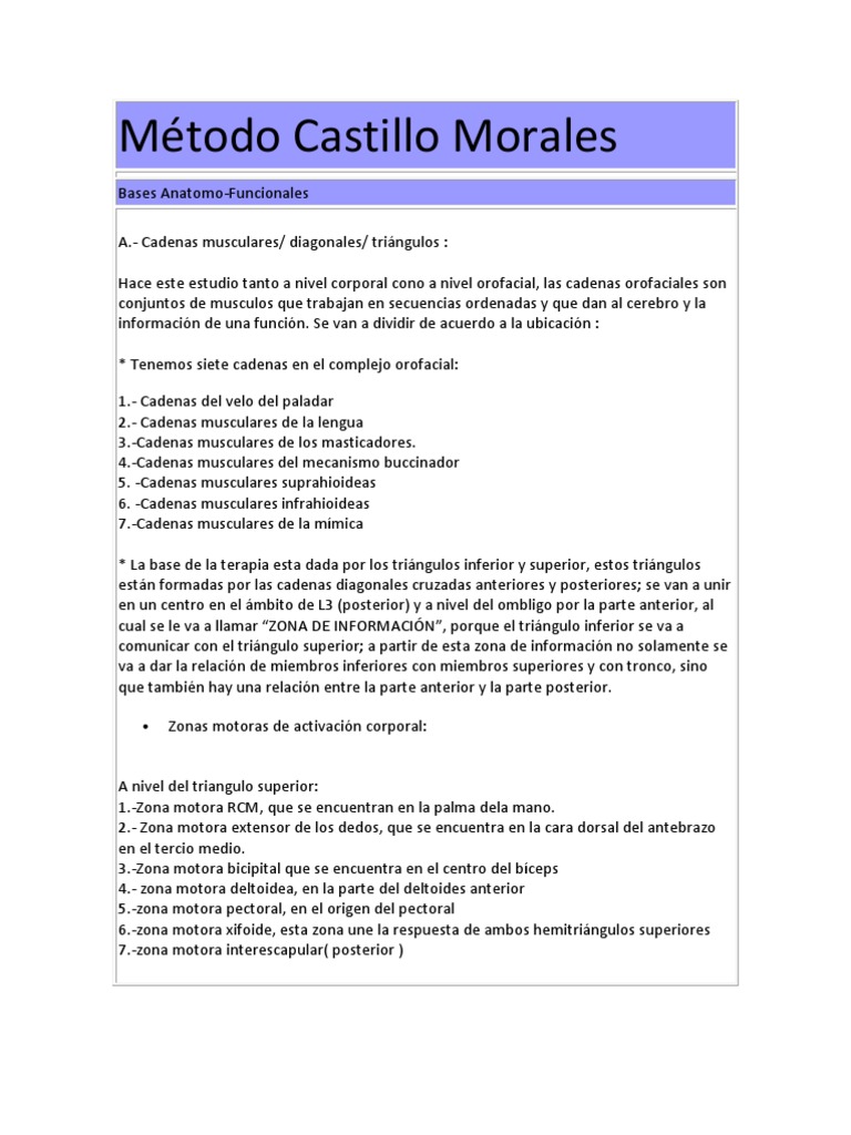 2 Lograr la integracin corporal. 3 Lograr empata del terapeuta fsico con el paciente. 4 Que el nio nos acepte adems de darnos confianza puesto que sin este factor no se logra los objetivos trazados. Consta de dos partes: -Calma motora: Es una tcnica que nos permite lograr funciones por medio de la relajacin. -Modelacin: Con esto logramos la comunicacin con nuestro paciente por medio del tacto que es muy importante dentro del concepto CASTILLO MORALES, tambin nos permite la evaluacin y la localizacin de bloqueos, los cuales eliminaremos mediante el uso de recursos tcnicos. Los objetivos principales son: Activacin y regulacin de exteroceptores y propioceptores. Preparacin de cadenas dando las condiciones optimas para su activacin. Favorece la receptividad corporal. Disminucin de productos qumicos txicos musculares.