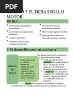Presenta movimientos ideomusculares, Aparecen los mamelones de los miembros inferiores, Las manos llegan a la lnea media, aparece la relacin mano boca, (conquista de las manos), Comienza la rotacin de la cabeza, Aparecen los esbozos de los prpados y pupilas, Inicia la prono-supinacin de los pies, Aparecen movimientos vermiformes del tronco y extremidades Reacciones: Aparece la primera reaccin, la relacin mano-boca Anatoma neurolgica: la induccin ventral, que se da entre la quinta y sexta semana de gestacin, Ac se da la definicin de las vesculas cerebrales primitivas. 3. Tercer periodo o periodo fetal precoz, que va desde la octava semana al cuarto mes de gestacin: Movilidad espontnea: Aparecen los primeros movimientos neurales del sistema nervioso central, son movimientos rpidos y amplios, son groseros ya que predomina el desarrollo del sistema extrapiramidal, Aparecen movimientos reflejos, Aparecen los mecanismos musculares de flexo-extensin, Entrecruza sus piernas, El movimiento que se da es homolateral, no hay movimientos en diagonal. Reflejos: En la semana once, aparece el reflejo oral, por apertura y cierre de la boca (succin y bsqueda). Se introduce el pulgar a la boca, reflejo de succin; A las doce semanas el feto deglute regularmente lquido amnitico; Reflejo anal, cierre definitivo del esfnter anal; Aparece el reflejo tnico laberntico asimtrico, por la posicin de la cabeza en el espacio, el nio empieza a manejar la postura al cambiar de posicin en el lquido amnitico. Aqu empiezan a actuar los receptores vestibulares; A la semana catorce aparecen los receptores propioceptivos y la maduracin de los husos musculares. Anatoma neurolgica: Se da la tercera etapa, la de proliferacin. La rpida maduracin de neuronas del SNC (neuroblastos y glioblastos) 4. Cuarto periodo o periodo fetal medio, que va desde el cuarto mes de gestacin al sexto mes de gestacin: Movilidad espontanea: Aparecen movimientos de rolido (al quinto o sexto mes), Descubre sus pies, Inicia los movimientos respiratorios suaves, Inicia la mascacin, apertura y cierre de la boca, Se van agrupando la zona de los receptores, en la lengua hay mas receptores tctiles que gustativos con el desarrollo esto se invierte, Aparece la expresin facial. En este periodo la madre debe hablarle mucho al beb. Reflejos: Aparece el reflejo de marcha automtica, Reflejo de prehensin primitivo, Reflejo de