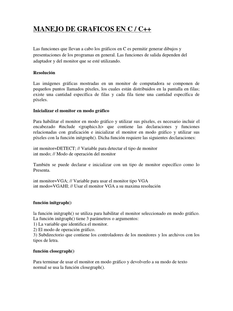 Las funciones que llevan a cabo los grficos en C es permitir generar dibujos y presentaciones de los programas en general. Las funciones de salida dependen del adaptador y del monitor que se est utilizando. Resolucin Las imgenes grficas mostradas en un monitor de computadora se componen de pequeos puntos llamados pxeles, los cuales estn distribuidos en la pantalla en filas; existe una cantidad especfica de filas y cada fila tiene una cantidad especfica de pxeles. Inicializar el monitor en modo grfico Para habilitar el monitor en modo grfico y utilizar sus pxeles, es necesario incluir el encabezado #include <graphics.h> que contiene las declaraciones y funciones relacionadas con graficacin e inicializar el monitor en modo grfico y utilizar sus pxeles con la funcin initgraph(). Dicha funcin requiere las siguientes declaraciones: int monitor=DETECT; // Variable para detectar el tipo de monitor int modo; // Modo de operacin del monitor Tambin se puede declarar e inicializar con un tipo de monitor especfico como lo Presenta. int monitor=VGA; // Variable para usar el monitor tipo VGA int modo=VGAHI; // Usar el monitor VGA a su maxima resolucin