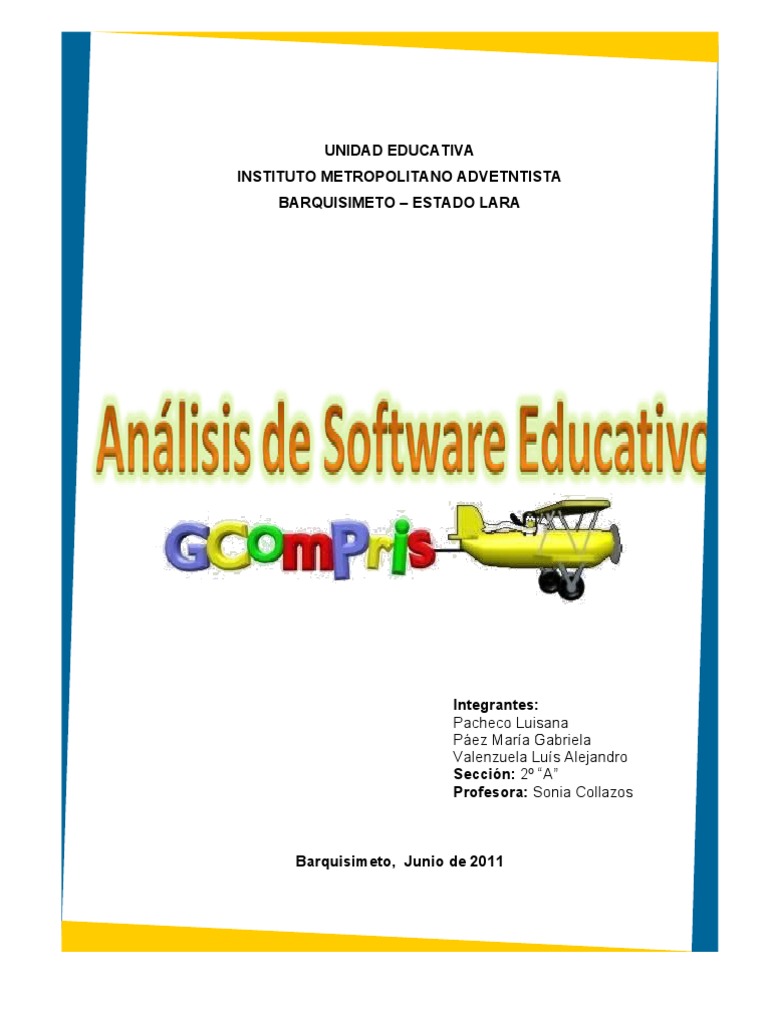 ANLISIS SOFTWARE EDUCATIVO Origen y ao de fabricacin, nombre del software Fue creado por Bruno Coudin (2000), ingeniero informtico francs. Nombre del Software GCompris Objetivo del software En total, GCompris comprende ms de 100 actividades y evoluciona constantemente. GCompris es Software Libre, por lo tanto tienes la posibilidad de adaptarlo a tus necesidades, o de mejorarlo, y porque no, de compartir tu trabajo con nios de todo el mundo. GCompris es completamente suite de software libre educativo que contiene una amplia gama de actividades. Ofrece diversas actividades destinadas a cubrir una gran variedad de campos tales como el funcionamiento de la computadora, usando el ratn y el teclado, el aprendizaje en general, lectura, escritura, idiomas extranjeros, el lgebra, as como diversas actividades tales como juegos de memoria y la lgica, cientfica. Edad recomendada para el usuario Es un programa de cmputo educacional con diferentes actividades para nios entre 2 y 10 aos de edad
