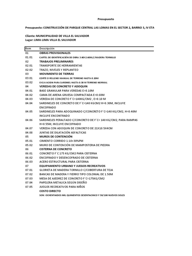 Presupuesto: CONSTRUCCIN DE PARQUE CENTRAL LAS LOMAS EN EL SECTOR 2, BARRIO 3, IV ETAPA URB. PACHACAMAC