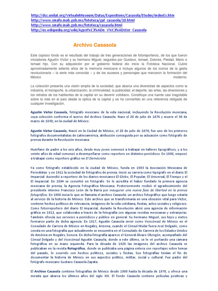 negativas, en diversos formatos y sobre diversos soportes fotogrficos. Desde 1976, est conservado en las salas climatizadas de la Fototeca Nacional, del Instituto Nacional de Antropologa e Historia (INAH) en Pachuca, Hidalgo, Mxico, en el antiguo convento franciscano, actualmente centro cultural. El trabajo de la fototeca consiste en asegurar la conservacin y la catalogacin del patrimonio fotogrfico. La fototeca rene actualmente 39 fondos, con un total de 850 000 piezas Agustn Vctor Casasola y Miguel Casasola son los pioneros del fotorreportaje, el primer estilo de reportaje autntico en la fotografa latinoamericana. De sus fotos de la Revolucin mexicana naci el archivo, en pleno auge de los Casasola en la carrera de fotografa, pasando por la dcada de 1930, cuando muere, y posteriormente sus hijos continan la labor hasta la dcada de 1970. Este copioso fondo es el resultado del trabajo de tres generaciones de fotoreporteros, de los que fueron iniciadores Agustn Vctor y su hermano Miguel, seguidos por Gustavo, Ismael, Agustn hijo, Dolores, Piedad y Mario. La coleccin presenta una visin amplia de la sociedad, que abarca una diversidad de aspectos como la industria, el transporte, la urbanizacin, la criminalidad, la publicidad, el deporte, las artes, las diversiones y los retratos de los habitantes de la capital en su devenir cotidiano. La adquisicin, en 1976, del archivo Casasola por parte del gobierno mexicano, a travs del Instituto Nacional de Antropologa e Historia, dio origen a la Fototeca Nacional del INAH, a la que el gobierno encomend el resguardo de los materiales tomados por los hermanos Casasola y algunos otros fotgrafos entre 1895 y 1972. La coleccin se envi al ex convento de San Francisco en Pachuca, Hidalgo, donde permanece hasta la fecha. El Fondo Casasola de la Fototeca Nacional est integrado por 483.993 piezas, de las cuales 411.904 son negativos- en su mayora placas de vidrio y nitratos- y 72.089 positivos; de ellos, el 43% se encuentra digitalizado y disponible para su consulta en el catlogo automatizado del Sistema Nacional de Fototecas.