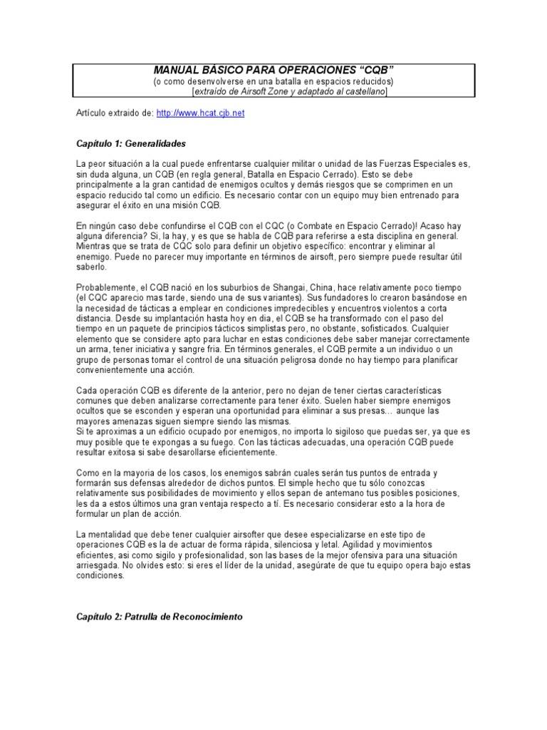 (o como desenvolverse en una batalla en espacios reducidos) [extrado de Airsoft Zone y adaptado al castellano] Artculo extraido de: http://www.hcat.cjb.net Captulo 1: Generalidades La peor situacin a la cual puede enfrentarse cualquier militar o unidad de las Fuerzas Especiales es, sin duda alguna, un CQB (en regla general, Batalla en Espacio Cerrado). Esto se debe principalmente a la gran cantidad de enemigos ocultos y dems riesgos que se comprimen en un espacio reducido tal como un edificio. Es necesario contar con un equipo muy bien entrenado para asegurar el xito en una misin CQB. En ningn caso debe confundirse el CQB con el CQC (o Combate en Espacio Cerrado)! Acaso hay alguna diferencia? Si, la hay, y es que se habla de CQB para referirse a esta disciplina en general. Mientras que se trata de CQC solo para definir un objetivo especfico: encontrar y eliminar al enemigo. Puede no parecer muy importante en trminos de airsoft, pero siempre puede resultar til saberlo. Probablemente, el CQB naci en los suburbios de Shangai, China, hace relativamente poco tiempo (el CQC aparecio mas tarde, siendo una de sus variantes). Sus fundadores lo crearon basndose en la necesidad de tcticas a emplear en condiciones impredecibles y encuentros violentos a corta distancia. Desde su implantacin hasta hoy en dia, el CQB se ha transformado con el paso del tiempo en un paquete de principios tcticos simplistas pero, no obstante, sofisticados. Cualquier elemento que se considere apto para luchar en estas condiciones debe saber manejar correctamente un arma, tener iniciativa y sangre fria. En trminos generales, el CQB permite a un individuo o un grupo de personas tomar el control de una situacin peligrosa donde no hay tiempo para planificar convenientemente una accin. Cada operacin CQB es diferente de la anterior, pero no dejan de tener ciertas caractersticas comunes que deben analizarse correctamente para tener xito. Suelen haber siempre enemigos ocultos que se esconden y esperan una oportunidad para eliminar a sus presas aunque las mayores amenazas siguen siempre siendo las mismas. Si te aproximas a un edificio ocupado por enemigos, no importa lo sigiloso que puedas ser, ya que es muy posible que te expongas a su fuego. Con las tcticas adecuadas, una operacin CQB puede resultar exitosa si sabe desarollarse eficientemente. Como en la mayoria de los casos, los enemigos sabrn cuales sern tus puntos de entrada y formarn sus defensas alrededor de dichos puntos. El simple hecho que tu slo conozcas relativamente sus posibilidades de movimiento y ellos sepan de antemano tus posibles posiciones, les da a estos ltimos una gran ventaja respecto a t. Es necesario considerar esto a la hora de formular un plan de accin. La mentalidad que debe tener cualquier airsofter que desee especializarse en este tipo de operaciones CQB es la de actuar de forma rpida, silenciosa y letal. Agilidad y movimientos eficientes, asi como sigilo y profesionalidad, son las bases de la mejor ofensiva para una situacin arriesgada. No olvides esto: si eres el lder de la unidad, asegrate de que tu equipo opera bajo estas condiciones.