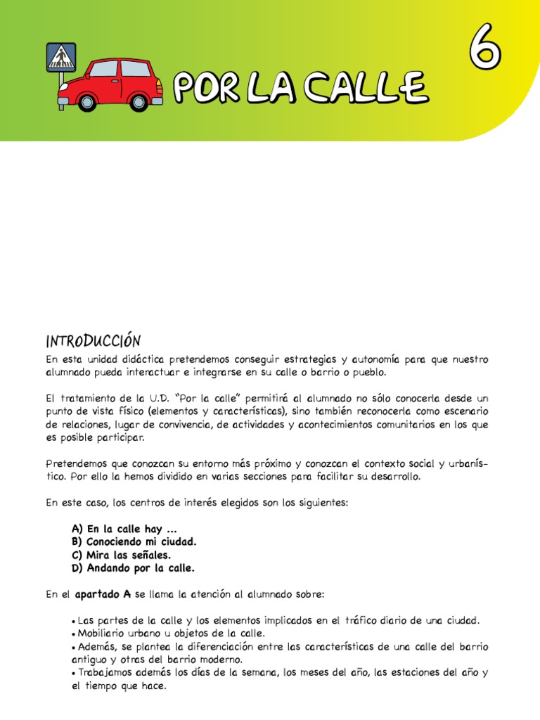 En esta unidad didctica pretendemos conseguir estrategias y autonoma para que nuestro alumnado pueda interactuar e integrarse en su calle o barrio o pueblo. El tratamiento de la U.D. Por la calle permitir al alumnado no slo conocerla desde un punto de vista fsico (elementos y caractersticas), sino tambin reconocerla como escenario de relaciones, lugar de convivencia, de actividades y acontecimientos comunitarios en los que es posible participar. Pretendemos que conozcan su entorno ms prximo y conozcan el contexto social y urbanstico. Por ello la hemos dividido en varias secciones para facilitar su desarrollo. En este caso, los centros de inters elegidos son los siguientes: A) B) C) D) En la calle hay ... Conociendo mi ciudad. Mira las seales. Andando por la calle.