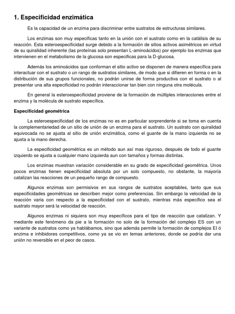 Es la capacidad de un enzima para discriminar entre sustratos de estructuras similares. Los enzimas son muy especificas tanto en la unin con el sustrato como en la catlisis de su reaccin. Esta esteroespecificidad surge debido a la formacin de sitios activos asimtricos en virtud de su quiralidad inherente (las protenas solo presentan L-aminocidos) por ejemplo los enzimas que intervienen en el metabolismo de la glucosa son especificas para la D-glucosa. Adems los aminocidos que conforman el sitio activo se disponen de manera especfica para interactuar con el sustrato o un rango de sustratos similares, de modo que si difieren en forma o en la distribucin de sus grupos funcionales, no podrn unirse de forma productiva con el sustrato o al presentar una alta especificidad no podrn interaccionar tan bien con ninguna otra molcula. En general la esteroespecificidad proviene de la formacin de mltiples interacciones entre el enzima y la molcula de sustrato especfica. Especificidad geomtrica La esteroespecificidad de los enzimas no es en particular sorprendente si se toma en cuenta la complementariedad de un sitio de unin de un enzima para el sustrato. Un sustrato con quiralidad equivocada no se ajusta al sitio de unin enzimtica, como el guante de la mano izquierda no se ajusta a la mano derecha. La especificidad geomtrica es un mtodo aun as mas riguroso, despus de todo el guante izquierdo se ajusta a cualquier mano izquierda aun con tamaos y formas distintas. Los enzimas muestran variacin considerable en su grado de especificidad geomtrica. Unos pocos enzimas tienen especificidad absoluta por un solo compuesto, no obstante, la mayora catalizan las reacciones de un pequeo rango de compuesto. Algunos enzimas son permisivos en sus rangos de sustratos aceptables, tanto que sus especificidades geomtricas se describen mejor como preferencias. Sin embargo la velocidad de la reaccin varia con respecto a la especificidad con el sustrato, mientras ms especfico sea el sustrato mayor ser la velocidad de reaccin. Algunos enzimas ni siquiera son muy especficos para el tipo de reaccin que catalizan. Y mediante este fenmeno da pie a la formacin no solo de la formacin del complejo ES con un variante de sustratos como ya hablbamos, sino que adems permite la formacin de complejos EI enzima e inhibidores competitivos, como ya se vio en temas anteriores, donde se podra dar una unin no reversible en el peor de casos.