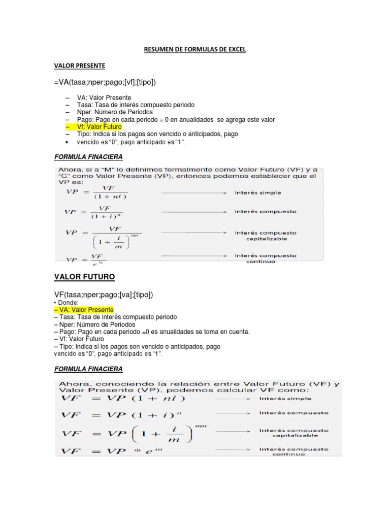 RESUMEN DE FORMULAS DE EXCEL VALOR PRESENTE