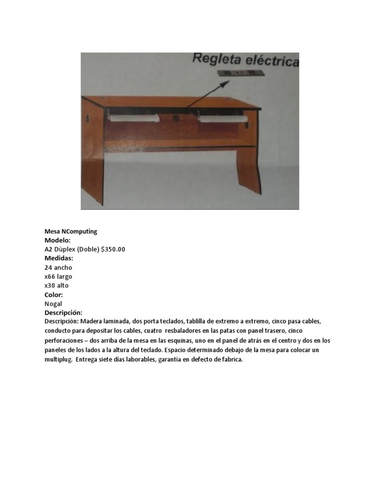 Descripcin: Madera laminada, dos porta teclados, tablilla de extremo a extremo, cinco pasa cables, conducto para depositar los cables, cuatro resbaladores en las patas con panel trasero, cinco perforaciones dos arriba de la mesa en las esquinas, uno en el panel de atrs en el centro y dos en los paneles de los lados a la altura del teclado. Espacio determinado debajo de la mesa para colocar un multiplug. Entrega siete das laborables, garanta en defecto de fabrica.