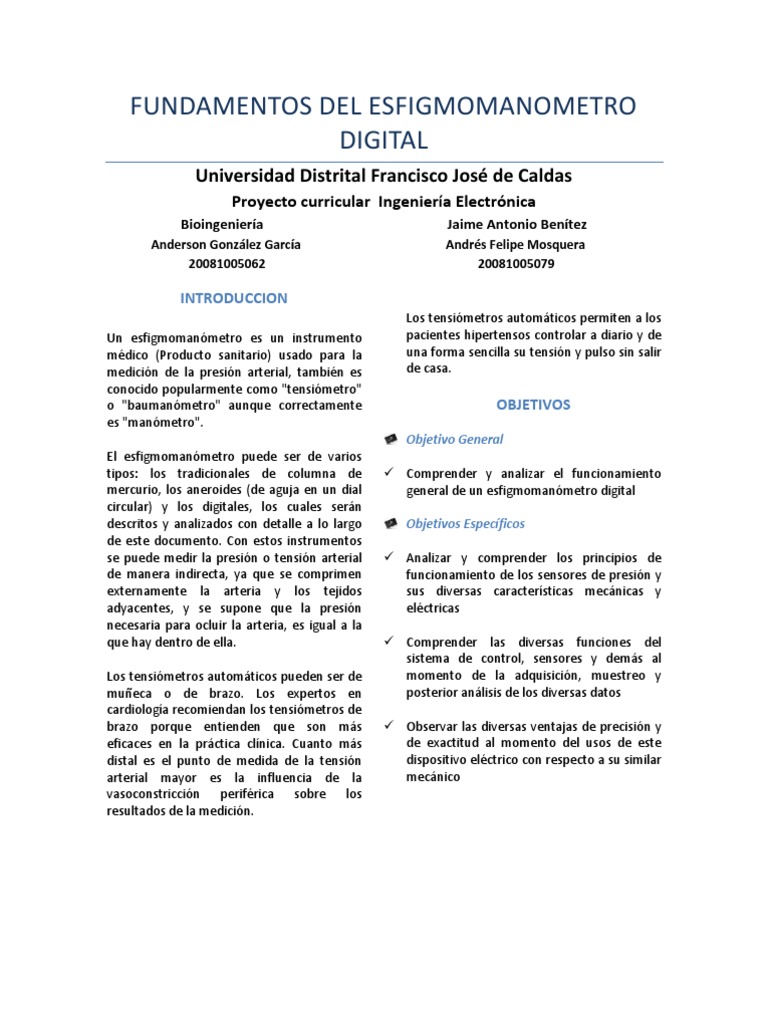 Objetivo General Comprender y analizar el funcionamiento general de un esfigmomanmetro digital Objetivos Especficos Analizar y comprender los principios de funcionamiento de los sensores de presin y sus diversas caractersticas mecnicas y elctricas Comprender las diversas funciones del sistema de control, sensores y dems al momento de la adquisicin, muestreo y posterior anlisis de los diversas datos Observar las diversas ventajas de precisin y de exactitud al momento del usos de este dispositivo elctrico con respecto a su similar mecnico
