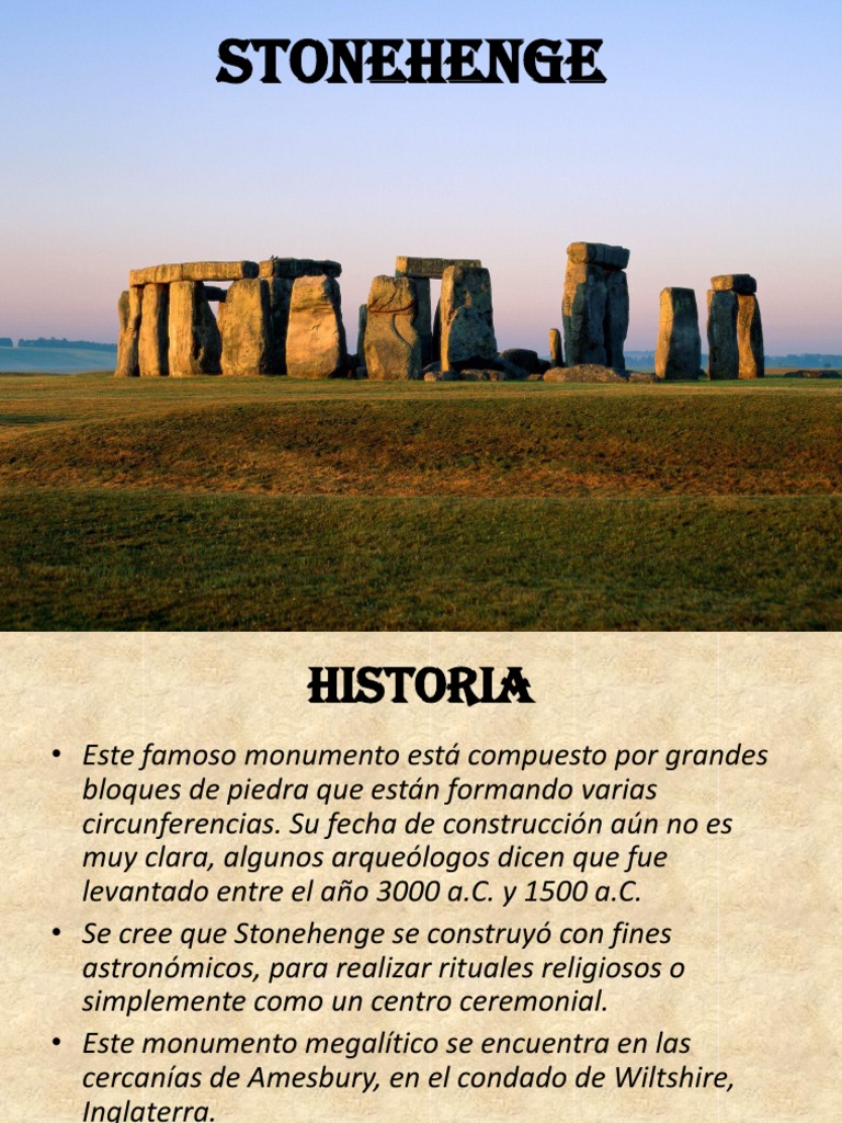 Este famoso monumento est compuesto por grandes bloques de piedra que estn formando varias circunferencias. Su fecha de construccin an no es muy clara, algunos arquelogos dicen que fue levantado entre el ao 3000 a.C. y 1500 a.C. Se cree que Stonehenge se construy con fines astronmicos, para realizar rituales religiosos o simplemente como un centro ceremonial. Este monumento megaltico se encuentra en las cercanas de Amesbury, en el condado de Wiltshire, Inglaterra.