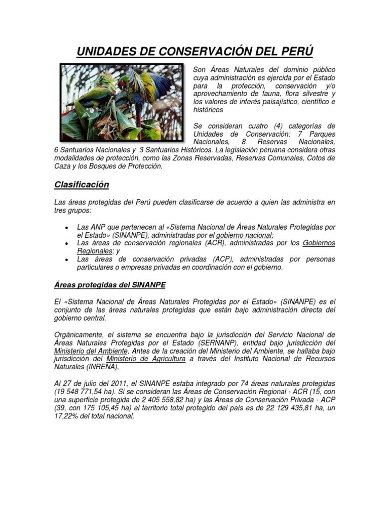 Son reas Naturales del dominio pblico cuya administracin es ejercida por el Estado para la proteccin, conservacin y/o aprovechamiento de fauna, flora silvestre y los valores de inters paisajstico, cientfico e histricos Se consideran cuatro (4) categoras de Unidades de Conservacin: 7 Parques Nacionales, 8 Reservas Nacionales, 6 Santuarios Nacionales y 3 Santuarios Histricos. La legislacin peruana considera otras modalidades de proteccin, como las Zonas Reservadas, Reservas Comunales, Cotos de Caza y los Bosques de Proteccin.