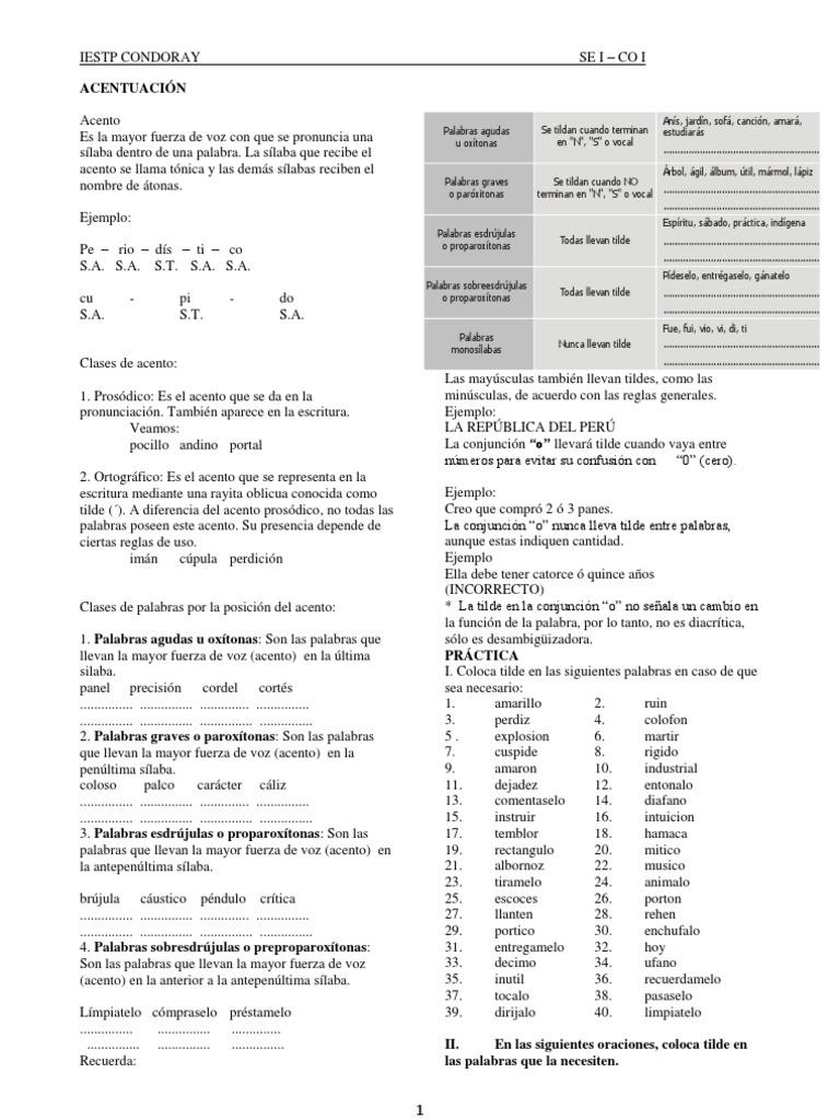 Las maysculas tambin llevan tildes, como las minsculas, de acuerdo con las reglas generales. Ejemplo: LA REPBLICA DEL PER La conjuncin o llevar tilde cuando vaya entre nmeros para evitar su confusin con 0 (cero). Ejemplo: Creo que compr 2 3 panes. La conjuncin o nunca lleva tilde entre palabras, aunque estas indiquen cantidad. Ejemplo Ella debe tener catorce quince aos (INCORRECTO) * La tilde en la conjuncin o no seala un cambio en la funcin de la palabra, por lo tanto, no es diacrtica, slo es desambigizadora. PRCTICA I. Coloca tilde en las siguientes palabras en caso de que sea necesario: 1. amarillo 2. ruin 3. perdiz 4. colofon 5. explosion 6. martir 7. cuspide 8. rigido 9. amaron 10. industrial 11. dejadez 12. entonalo 13. comentaselo 14. diafano 15. instruir 16. intuicion 17. temblor 18. hamaca 19. rectangulo 20. mitico 21. albornoz 22. musico 23. tiramelo 24. animalo 25. escoces 26. porton 27. llanten 28. rehen 29. portico 30. enchufalo 31. entregamelo 32. hoy 33. decimo 34. ufano 35. inutil 36. recuerdamelo 37. tocalo 38. pasaselo 39. dirijalo 40. limpiatelo II. En las siguientes oraciones, coloca tilde en las palabras que la necesiten.
