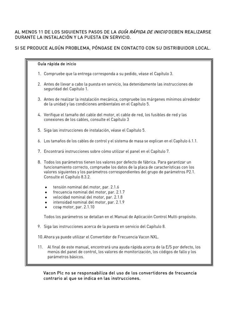 Vacon Plc no se responsabiliza del uso de los convertidores de frecuencia contrario al que se indica en las instrucciones.