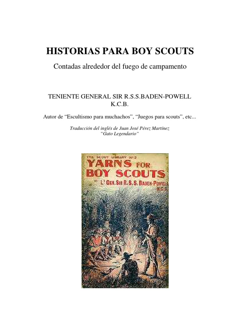 stas historias son meramente adicionales a las que aparecen en el manual de Escultismo para muchachos. La mayora de ellas ya han aparecido publicadas en nuestro peridico El Scout, pero ante la demanda de que fuesen reimpresas, las he reunido ahora y las ofrezco en formato de libro para su uso por scouts y monitores. Para stos ltimos pueden encontrarse unas reseas especiales al final del libro, tambin dirigidas a las monitoras, esto es, a las seoritas que desean ofrecer el escultismo a las muchachas. Junio, 1909 R.S.S.B.P.
