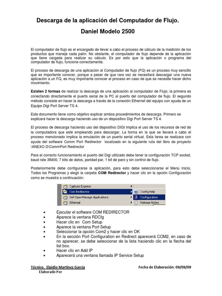 El computador de flujo es el encargado de llevar a cabo el proceso de clculo de la medicin de los productos que maneje cada patn. No obstante, el computador de flujo depende de la aplicacin que tiene cargada para realizar su clculo. Es por esto que la aplicacin o programa del computador de flujo, funcione correctamente. El proceso de descarga de una aplicacin al Computador de flujo (FQ) es un proceso muy sencillo que es importante conocer, porque a pesar de que rara vez se necesitar descargar una nueva aplicacin a un FQ, es muy importante conocer el proceso en caso de que se necesite hacer dicho movimiento. Existen 2 formas de realizar la descarga de una aplicacin al computador de Flujo, la primera es conectando directamente el puerto serial de la PC al puerto del computador de flujo. El segundo mtodo consiste en hacer la descarga a travs de la conexin Ethernet del equipo con ayuda de un Equipo Digi Port Server TS 4. Este documento tiene como objetivo explicar ambos procedimientos de descarga. Primero se explicar hacer la descarga haciendo uso de un dispositivo Digi Port Server TS 4. El proceso de descarga haciendo uso del dispositivo DIGI implica el uso de los recursos de red de la computadora que est empleando para descargar. La forma en la que se llevar a cabo el proceso mencionado implica la emulacin de un puerto serial virtual. Esta tarea se realizara con ayuda del software Comm Port Redirector localizado en la siguiente ruta del libro de proyecto \ANEXO D\CommPort Redirector Para el correcto funcionamiento el puerto del Digi utilizado debe tener la configuracin TCP socket, baud rate 38400, 7 bits de datos, paridad par, 1 bit de paro y sin control de flujo. Posteriormente debe configurarse la aplicacin, para esto debe seleccionarse el Men Inicio, Todos los Programas y elegir la carpeta COM Redirector y hacer clic en la opcin Configuracin como se muestra a continuacin: