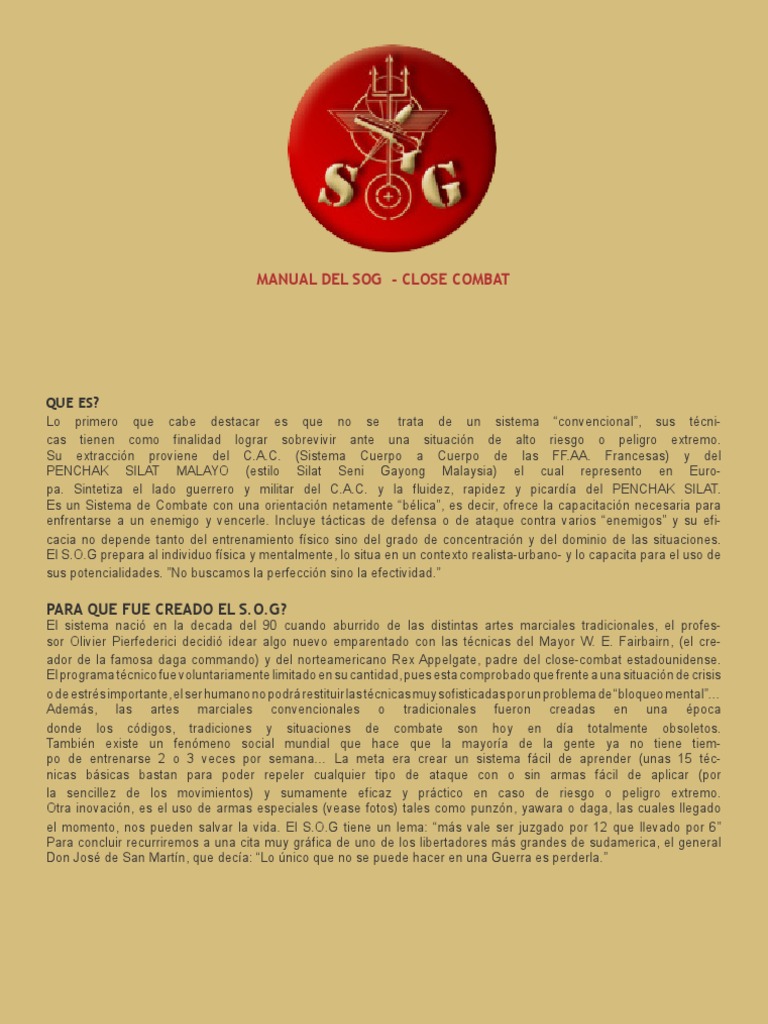 Lo primero que cabe destacar es que no se trata de un sistema convencional, sus tcnicas tienen como finalidad lograr sobrevivir ante una situacin de alto riesgo o peligro extremo. Su extraccin proviene del C.A.C. (Sistema Cuerpo a Cuerpo de las [Link]. Francesas) y del PENCHAK SILAT MALAYO (estilo Silat Seni Gayong Malaysia) el cual represento en Europa. Sintetiza el lado guerrero y militar del C.A.C. y la fluidez, rapidez y picarda del PENCHAK SILAT. Es un Sistema de Combate con una orientacin netamente blica, es decir, ofrece la capacitacin necesaria para enfrentarse a un enemigo y vencerle. Incluye tcticas de defensa o de ataque contra varios enemigos y su eficacia no depende tanto del entrenamiento fsico sino del grado de concentracin y del dominio de las situaciones. El S.O.G prepara al individuo fsica y mentalmente, lo situa en un contexto realista-urbano- y lo capacita para el uso de sus potencialidades. No buscamos la perfeccin sino la efectividad.
