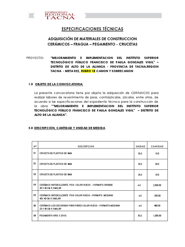 1.0 OBJETO DE LA CONVOCATORIA: La presente convocatoria tiene por objeto la adquisicin de CERMICOS para realizar labores de revestimiento de pisos, contrazcalos, zcalos, entre otros, de acuerdo a las especificaciones del expediente tcnico para la construccin de la obra MEJORAMIENTO E IMPLEMENTACION DEL INSTITUTO SUPERIOR TECNOLGICO PBLICO FRANCISCO DE PAULA GONZALES VIGIL DISTRITO DE ALTO DE LA ALIANZA.