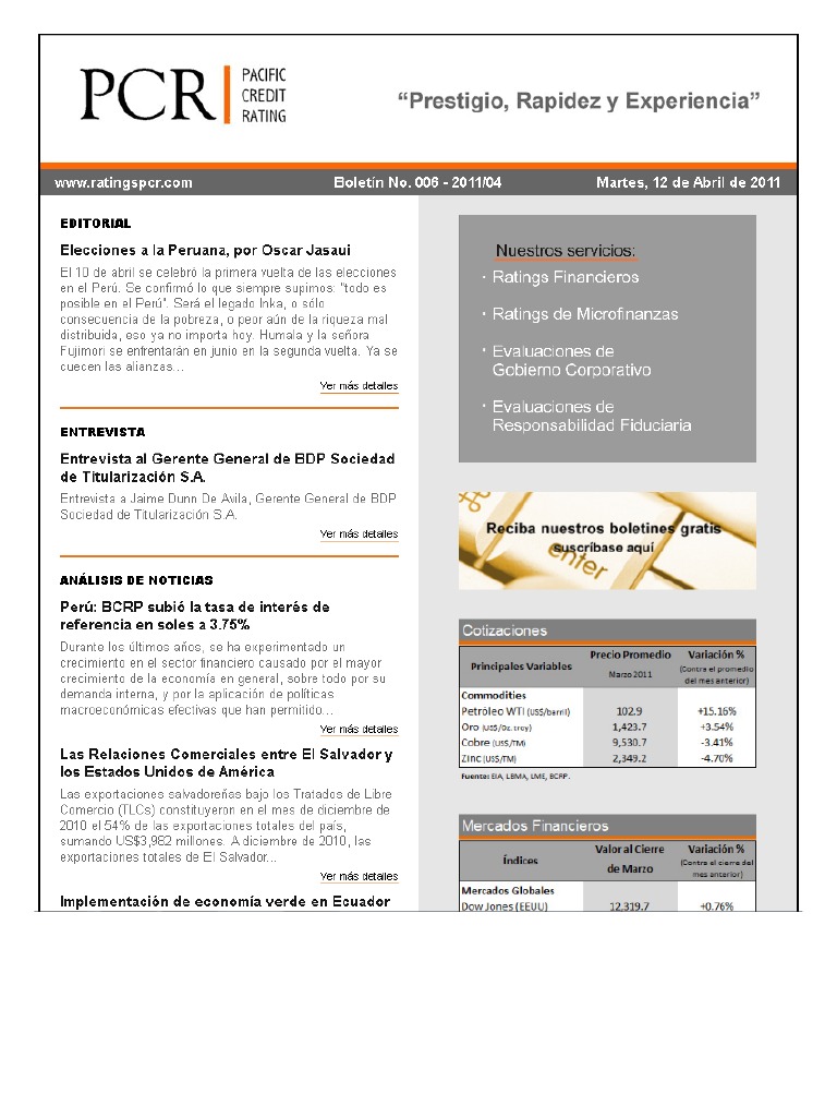 PCR-PACIFIC CREDIT RATING tuvo el agrado de entrevistar a Jaime Dunn De Avila sobre la Titularizacin en Bolivia. PCR: Cul ha sido el impacto de la titularizacin en el Mercado de Valores y la economa boliviana? JD: A travs de los procesos de titularizacin se incrementaron los participantes en el Mercado de Valores Boliviano, ingresando mayor nmero de Entidades que pueden financiarse a travs de la Bolsa de Valores. Por ejemplo las PYMES puedan acceder a este mecanismo; as como las Cooperativas como es el caso de COBOCE y las ONGs como es el caso de CRECER.. Al ser el emisor el Patrimonio Autnomo y no as la Entidad que requiere los recursos, pueden financiarse aquellos que directamente no pueden ir a la Bolsa de Valores por tamao o personera jurdica. La titularizacin ha permitido la democratizacin en el acceso al mercado de capitales, Las titularizaciones realizadas por el BDP ST, significaron en las gestiones 2008 y el 2009, el 60% y 82% de las colocaciones realizadas en la Bolsa Boliviana de Valores, habindose registrado las emisiones ms cuantiosas y de mayor calificacin de riesgo (AAA) de la historia del mercado de valores nacional, contribuyendo as el BDP ST al desarrollo del mismo. El impacto en la economa Boliviana se dio al incrementar el volumen financiado por el mercado de valores con recursos ms baratos, lo cual ha fortalecido los balances e incrementado los activos de importantes empresas cuyas operaciones han impactado en el sector productivo y exportador de Bolivia, como el elctrico, minero, gas y electricidad, farmacutico, cementero, hotelero, y otros. PCR: Cules son las ventajas de emitir valores en procesos de titularizacin respecto a otro tipo de valores? JD: La titularizacin tiene una gran caracterstica, la financiacin viene por el lado del Activo ya que en algunos casos las Empresas pueden financiarse cediendo sus flujos futuros o algn activo generador de flujos, y la segunda ventaja es que travs de los Patrimonios Autnomos que es el Emisor y puede introducir a diferentes tipos de empresas, Cooperativas, Instituciones Financieras de Desarrollo, Sociedades Mixtas, y otro tipo de empresas que por su tamao no pueden acceder solas al Mercado de Valores, que vendran a ser los Originadores en los procesos de titularizacin. En cambio para el caso de las emisiones de bonos o pagars se financian mediante deuda registrada en su Pasivo, y a este tipo de financiamiento solo tienen acceso las Sociedades Annimas (S.A.) y Sociedades de Responsabilidad Limitada.(S.R.L.), que son empresas grandes y consolidadas. PCR: Cules fueron los principales logros del BDP Sociedad de Titularizacin S.A. en los ltimos aos? JD: Desde el punto de vista de la titularizacin se ha logrado introducir al mercado de valores nuevos productos e innovaciones como son las Notas Estructuradas y otro tipo de estructuras y modelos desarrollados especialmente para el financiamiento de las PYMES y las ONGs microcrediticias.