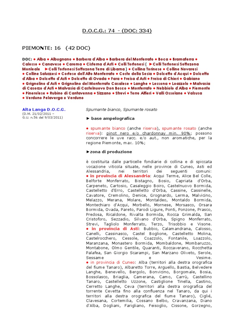 Romano Canavese. Iseo. Ruché di Castagnole Monferrato (D. Mazzè. Vialfrè. nonché la parte del territorio dei comuni di Cologne. Ome. Refrancore. Azeglio.U. Borgomasino. rosé. Caluso. n. Ivrea.157 del 7/7/2008) satèn. spumante. n. in provincia di Vercelli: il comune di Moncrivello. Cossano Canavese. per la produzione del vino Franciacorta satèn non è consentito l'impiego delle uve Pinot nero. Adro. Strambino. Provaglio d'Iseo. San Giorgio Canavese. Grana.M. Rodengo Saiano.M. per la produzione del vino Franciacorta rosé (rosato) il contenuto delle uve Pinot nero deve essere superiore al 25% del totale. n.M. la versione passito liquoroso è stata revocata nel 1998. Ruché. Maglione.248 del 22/10/2010) base ampelografica: Erbaluce. Villareggia e Vische. Montalenghe.in provincia di Brescia: comprende i terreni vocati alla qualità di tutto il territorio dei comuni di Paratico. 18/8/2010 . Palazzo Canavese. Monticelli Brusati. Perosa Canavese. può essere presente Pinot bianco max 50%. San Martino Canavese. 573 e n. Candia Canavese. Cellatica e Gussago.248 del 22/10/2010) Rosso base ampelografica: 90% Brachetto per il restante. Martino che si trova a nord delle ex strade statali n. Scurzolengo e Viarigi. zona di produzione: comprende l'intero territorio dei seguenti comuni: in provincia di Torino: Agliè. riserva base ampelografica: Chardonnay e/o Pinot nero. Mercenasco. Barone.U. Paderno Franciacorta. 8/10/2010 . Piverone. Cuceglio. Bollengo. 11 e parte del territorio del comune di Brescia. Millesimato. Caravino.G. Bairo. Burolo. Viverone e Zimone. zona di produzione: . Erbusco. Coccaglio. Rovato e Cazzago S. Scarmagno. LOMBARDIA: 5 (22 DOC) DOC: ● Bonarda dell'Oltrepò Pavese ● Botticino ● Buttafuoco dell'Oltrepò Pavese o Buttafuoco ● Capriano del Colle ● Casteggio ● Cellatica ● Curtefranca ● Garda ● Garda Colli Mantovani ● Lambrusco Mantovano ● Lugana ● Oltrepò Pavese ● Pinot Grigio dell'Oltrepò Pavese ● Pinot Nero dell'Oltrepò Pavese ● Riviera del Garda Bresciano o Garda Bresciano ● San Colombano al Lambro o San Colombano ● Sangue di Giuda dell'Oltrepò Pavese o Sangue di Giuda ● San Martino della Battaglia ● Terre del Colleoni o Colleoni ● Valcalepio ● Valtellina Rosso o Rosso di Valtellina ● Valtènesi Franciacorta (D.U. . Cortefranca. 25/6/2008 . Orio Canavese. Parella. Capriolo.Erbaluce di Caluso o Caluso bianco. Settimo Rottaro.G. passito (anche riserva) (D. min.G. Portacomaro. Barbera e/o zona di produzione: comprende l'intero territorio dei seguenti comuni in provincia di Asti: Castagnole Monferrato. Passirano. in provincia di Biella: i comuni di Roppolo. Montemagno. Vestignè.