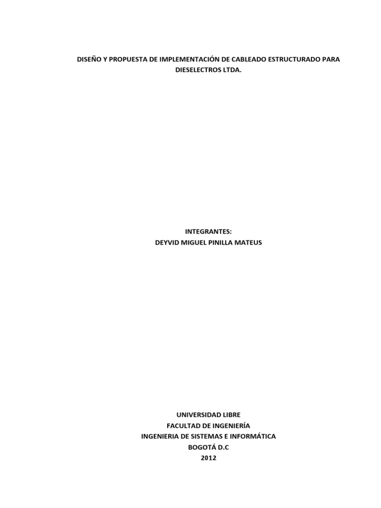 El cableado estructurado ha surgido y mejorado con el pasar del tiempo como una opcin de establecer redes de rea local LAN ms estables, seguras y veloces que han de solventar gran cantidad de inconvenientes de conexin, intrusiones y trfico lento entre otros problemas que deben enfrentar los diseadores de red. Hoy en da un cableado estructurado se encuentra en la gran mayora de las organizaciones y de acuerdo a unas polticas deben tener cierto nivel de seguridad y estabilidad para soportar un sistema. En este proyecto se realiza un anlisis de la situacin actual y se establece un diseo de una red de rea local LAN para la empresa DIESELECTROS LTDA; Basado en las normas y estndares establecidos que conforman un cableado estructurado. En los entregables del proyecto, se establece un cronograma, un prototipo de las instalaciones y distribucin de cada punto (red datos - voz, red elctrica, aire acondicionado, ubicacin dispositivos de red, ubicacin del Data Center, etc.), adicionalmente la segmentacin de red, el tipo de seguridad y la distribucin de los equipos en el edificio.