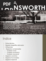 La Casa Farnsworth, como muchos autores coinciden en postulados de una arquitectura moderna representa una obra ANTIDECORATIVA: la belleza la encuentra en la pureza de la forma: menos es ms. ANTIMONUMENTAL: la forma se impone por su simpleza y no por formalidades clsicas. ABIERTA: la conexin interior exterior es casi total, la visual del observador es ilimitada. FLOTANTE: el espacio es liviano, fluye y recorre casi simultneamente toda la casa. EN EQUILIBRIO DINMICO: el equilibrio no se da por la simetra si no por el dinamismo formal. ANTICBICA: por mas de que sea un prisma cerrado, no es pramente interior como la arquitectura clsica concebida como cajas cerradas, la relacin interior exterior es casi total. Adems, el prisma no es un volumen en s, si no que se descompone visualmente en lneas, planos horizontales (planta y techo) y planos verticales transparentes (cerramientos) . La obra, como coinciden los principios de la arquitectura moderna, rompe con todos los sistemas compositivos formales clsicos. No tiene jerarquas, por mas que parezca no posee simetras desde ningn punto del conjunto volmen-plano; no tiene adornos, ni gruesas columnas portantes. Asimismo, Mies Van der Rohe lleg a la armona visual y al equilibrio dinmico por orden y sistemas compositivos modernos. Entre unos de ellos, el arquitecto se caracteriz por la utilizacin de una grilla tridimensional para proyectar la distribucin formal de los elementos en el espacio.