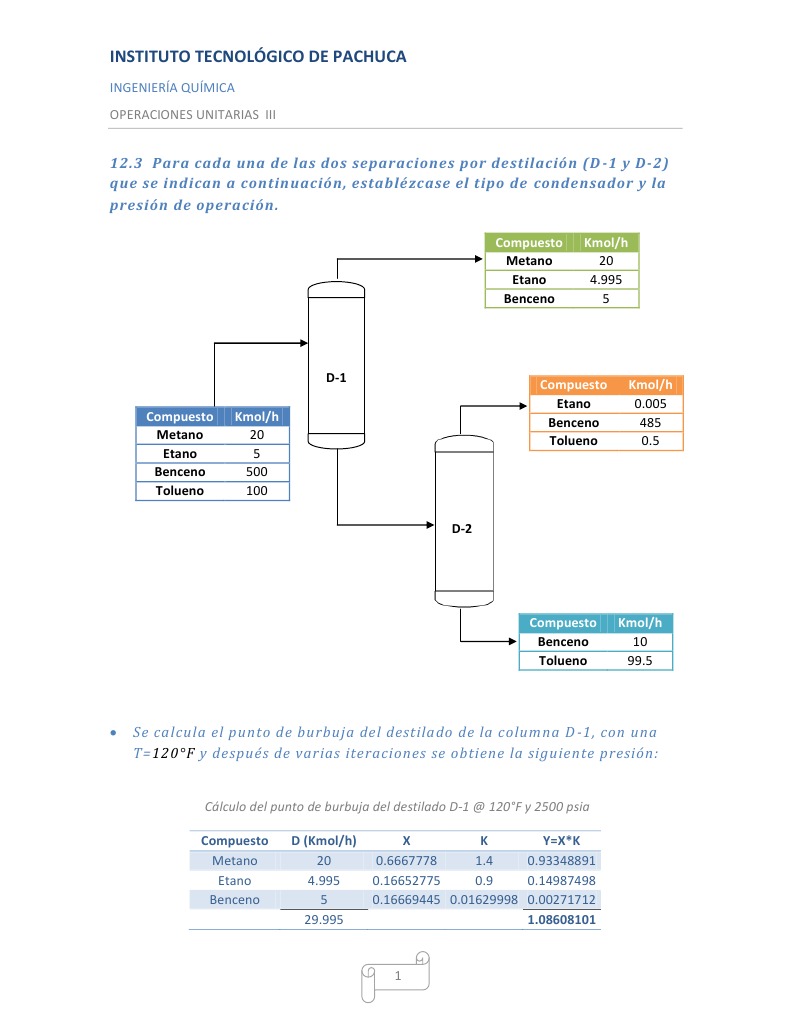 12.3 Para cada una de las dos separaciones por destilacin (D -1 y D-2) que se indican a continuacin, establzcase el tipo de condensador y la presin de operacin.