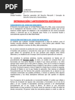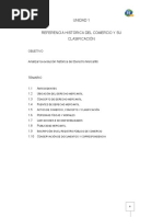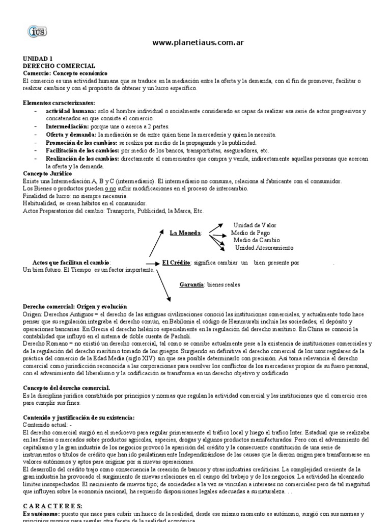 UNIDAD 1 DERECHO COMERCIAL Comercio: Concepto econmico El comercio es una actividad humana que se traduce en la mediacin entre la oferta y la demanda, con el fin de promover, facilitar o realizar cambios y con el propsito de obtener y un lucro especfico. Elementos caracterizantes: - actividad humana: solo el hombre individual o socialmente considerado es capas de realizar esa serie de actos progresivos y concatenados en que consiste el comercio. - Intermediacin: porque une o acerca a 2 partes. - Oferta y demanda: la mediacin se da entre quien tiene la mercadera y quien la necesita. - Promocin de los cambios: se realiza por medio de la propaganda y la publicidad. - Facilitacin de los cambios: por medio de los bancos, transportistas, aseguradores, etc. - Realizacin de los cambios: directamente el comerciantes que compra y vende, indirectamente aquellas personas que acercan la oferta y la demanda. Concepto Jurdico Existe una Intermediacin A, B y C (intermediario). El intermediario no consume, relaciona al fabricante con el consumidor. Los Bienes o productos pueden o no sufrir modificaciones en el proceso de intercambio. Finalidad de lucro: no siempre necesaria. Habitualidad, se crean hbitos en el consumidor. Actos Preparatorios del cambio: Transporte, Publicidad, la Marca, Etc. La Moneda: Unidad de Valor Medio de Pago Medio de Cambio Unidad Atesoramiento bien presente por .