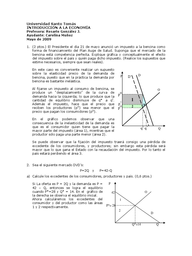 1. (2 ptos.) El Presidente el da 21 de mayo anunci un impuesto a la bencina como forma de financiamiento del Plan Auge de Salud. Suponga que el mercado de la bencina est competencia perfecta. Explique grfica y conceptualmente el efecto del impuesto sobre el pas y quin paga dicho impuesto. (Realice los supuestos que estime necesarios, siempre que sean reales). En este caso es conveniente realizar un supuesto sobre la elasticidad precio de la demanda de bencina, puesto que en la prctica la demanda por bencina es bastante inelstica. Al fijarse un impuesto al consumo de bencina, se produce un desplazamiento de la curva de demanda hacia la izquierda; lo que produce que la cantidad de equilibrio disminuye de q* a q I. Adems el impuesto, hace que el precio que reciben los productores (pO) sea menor que el precio que pagan los consumidores (pD). En el grfico podemos observar que una consecuencia de la inelasticidad de la demanda es que es el consumidor quien tiene que pagar la mayor parte del impuesto (rea 1), mientras que el productor slo paga una parte menor (rea 2).