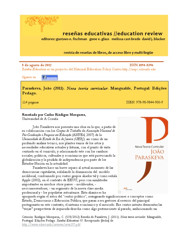 Citacin: Ridigos Mosquera,, C. (5/8/2012) Resea de Parasleva, J. (2011). Nova teoria curricular. Mangualde, Portugal: Edies Pedago. Reseas Educativas 15. Recuperado [fecha] de http://www.edrev.info/reviews/revs297.pdf
