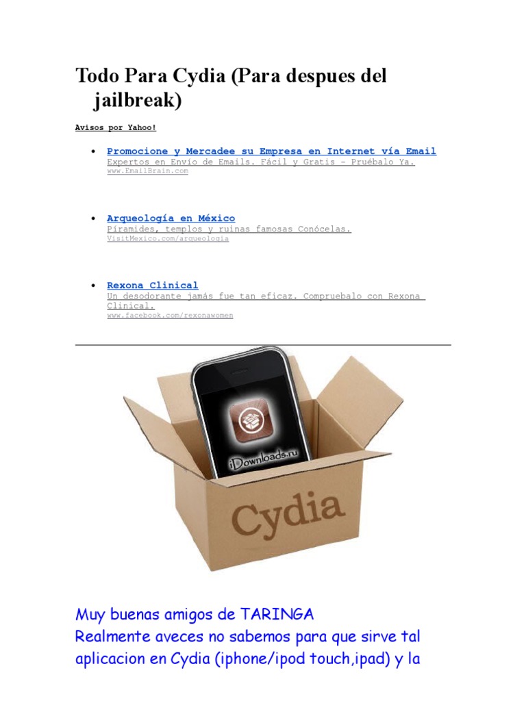 link: http://www.youtube.com/watch?v=_WnQDo_ngYM Bsico del Cydia Las aplicaciones bsicas las encontramos en, Cydia Featured Packages -Installous- es una aplicacin la cual te permite instalar aplicaciones del App Store pirateadas. - Categories Crear carpetas para ingresar aplicaciones o juegos - Cycorder Grabar vdeo en el Iphone 2G y 3G - Dtunes Reproduccin de mltiples archivos de audio y vdeo - Mxtube Descarga vdeos de Youtube - Backgrounder Multitareas para todos los dispositivos - SbSettings Men de tareas