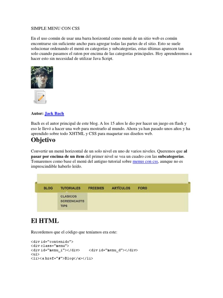 encontrarse sin suficiente ancho para agregar todas las partes de el sitio. Esto se suele solucionar ordenando el men en categoras y subcategoras, estas ltimas aparecen tan solo cuando pasamos el raton por encima de las categoras principales. Hoy aprenderemos a hacer esto sin necesidad de utilizar Java Script.