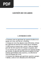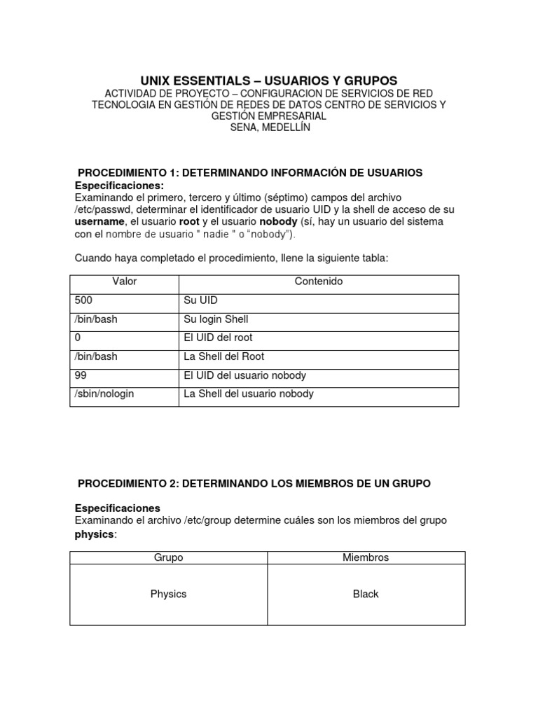 PROCEDIMIENTO 1: DETERMINANDO INFORMACIN DE USUARIOS Especificaciones: Examinando el primero, tercero y ltimo (sptimo) campos del archivo /etc/passwd, determinar el identificador de usuario UID y la shell de acceso de su username, el usuario root y el usuario nobody (s, hay un usuario del sistema con el nombre de usuario " nadie " o nobody). Cuando haya completado el procedimiento, llene la siguiente tabla: Valor 500 /bin/bash 0 /bin/bash 99 /sbin/nologin Su UID Su login Shell El UID del root La Shell del Root El UID del usuario nobody La Shell del usuario nobody Contenido