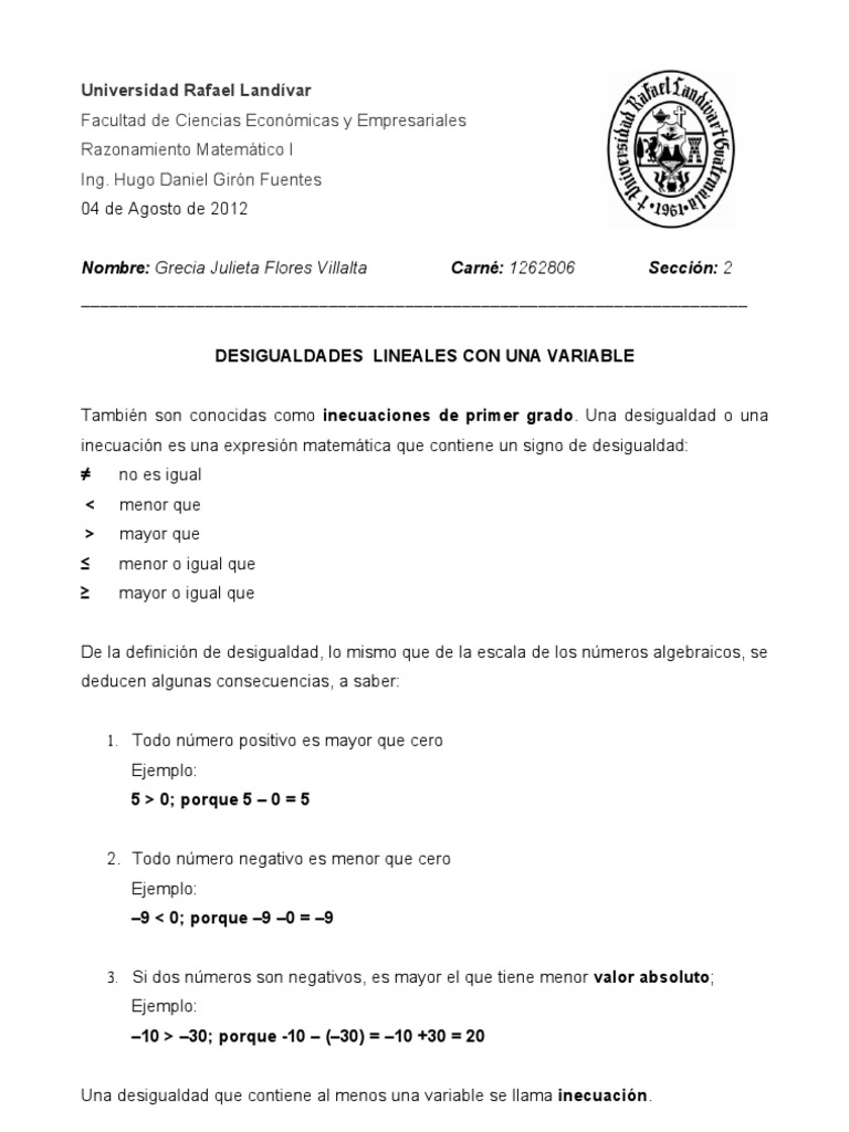 De la definicin de desigualdad, lo mismo que de la escala de los nmeros algebraicos, se deducen algunas consecuencias, a saber: 1. Todo nmero positivo es mayor que cero Ejemplo: 5 > 0; porque 5 0 = 5 2. Todo nmero negativo es menor que cero Ejemplo: 9 < 0; porque 9 0 = 9 3. Si dos nmeros son negativos, es mayor el que tiene menor valor absoluto; Ejemplo: 10 > 30; porque -10 (30) = 10 +30 = 20 Una desigualdad que contiene al menos una variable se llama inecuacin.