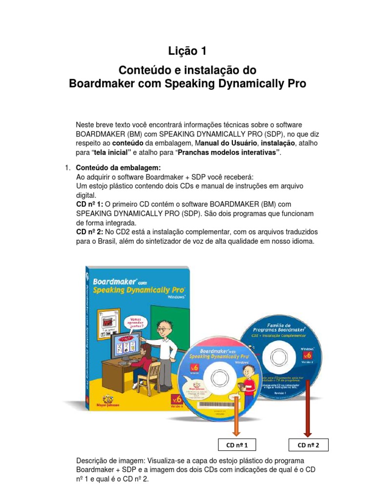 Neste breve texto voc encontrar informaes tcnicas sobre o software BOARDMAKER (BM) com SPEAKING DYNAMICALLY PRO (SDP), no que diz respeito ao contedo da embalagem, Manual do Usurio, instalao, atalho para tela inicial e atalho para Pranchas modelos interativas. 1. Contedo da embalagem: Ao adquirir o software Boardmaker + SDP voc receber: Um estojo plstico contendo dois CDs e manual de instrues em arquivo digital. CD n 1: O primeiro CD contm o software BOARDMAKER (BM) com SPEAKING DYNAMICALLY PRO (SDP). So dois programas que funcionam de forma integrada. CD n 2: No CD2 est a instalao complementar, com os arquivos traduzidos para o Brasil, alm do sintetizador de voz de alta qualidade em nosso idioma.
