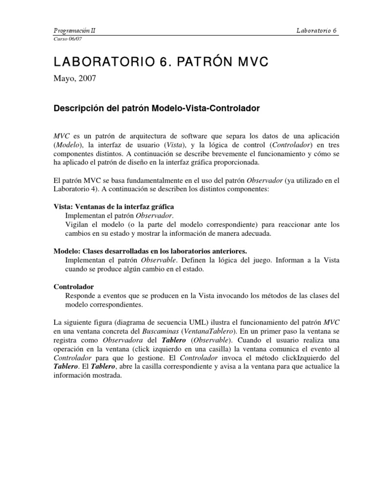 MVC es un patrn de arquitectura de software que separa los datos de una aplicacin (Modelo), la interfaz de usuario (Vista), y la lgica de control (Controlador) en tres componentes distintos. A continuacin se describe brevemente el funcionamiento y cmo se ha aplicado el patrn de diseo en la interfaz grfica proporcionada. El patrn MVC se basa fundamentalmente en el uso del patrn Observador (ya utilizado en el Laboratorio 4). A continuacin se describen los distintos componentes: Vista: Ventanas de la interfaz grfica Implementan el patrn Observador. Vigilan el modelo (o la parte del modelo correspondiente) para reaccionar ante los cambios en su estado y mostrar la informacin de manera adecuada. Modelo: Clases desarrolladas en los laboratorios anteriores. Implementan el patrn Observable. Definen la lgica del juego. Informan a la Vista cuando se produce algn cambio en el estado. Controlador Responde a eventos que se producen en la Vista invocando los mtodos de las clases del modelo correspondientes. La siguiente figura (diagrama de secuencia UML) ilustra el funcionamiento del patrn MVC en una ventana concreta del Buscaminas (VentanaTablero). En un primer paso la ventana se registra como Observadora del Tablero (Observable). Cuando el usuario realiza una operacin en la ventana (click izquierdo en una casilla) la ventana comunica el evento al Controlador para que lo gestione. El Controlador invoca el mtodo clickIzquierdo del Tablero. El Tablero, abre la casilla correspondiente y avisa a la ventana para que actualice la informacin mostrada.
