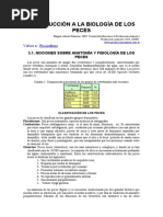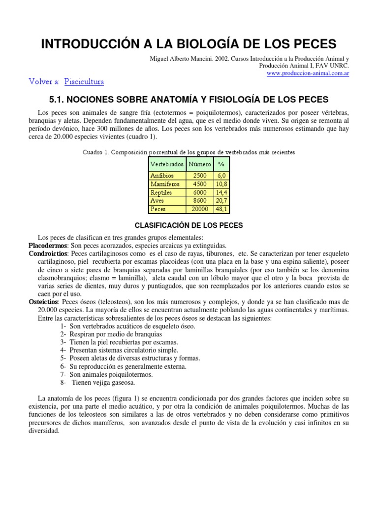 CLASIFICACIN DE LOS PECES Los peces de clasifican en tres grandes grupos elementales: Placodermos: Son peces acorazados, especies arcaicas ya extinguidas. Condroictios: Peces cartilaginosos como es el caso de rayas, tiburones, etc. Se caracterizan por tener esqueleto cartilaginoso, piel recubierta por escamas placoideas (con una placa en la base y una espina saliente), poseer de cinco a siete pares de branquias separadas por laminillas branquiales (por eso tambin se los denomina elasmobranquios; elasmo = laminilla), aleta caudal con un lbulo mayor que el otro y la boca provista de varias series de dientes, muy duros y puntiagudos, que son reemplazados por los anteriores cuando estos se caen por el uso. Osteictios: Peces seos (teleosteos), son los ms numerosos y complejos, y donde ya se han clasificado mas de 20.000 especies. La mayora de ellos se encuentran actualmente poblando las aguas continentales y martimas. Entre las caractersticas sobresalientes de los peces seos se destacan las siguientes: 1- Son vertebrados acuticos de esqueleto seo. 2- Respiran por medio de branquias 3- Tienen la piel recubiertas por escamas. 4- Presentan sistemas circulatorio simple. 5- Poseen aletas de diversas estructuras y formas. 6- Su reproduccin es generalmente externa. 7- Son animales poiquilotermos. 8- Tienen vejiga gaseosa. La anatoma de los peces (figura 1) se encuentra condicionada por dos grandes factores que inciden sobre su existencia, por una parte el medio acutico, y por otra la condicin de animales poiquilotermos. Muchas de las funciones de los teleosteos son similares a las de otros vertebrados y no deben considerarse como primitivos precursores de dichos mamferos, son avanzados desde el punto de vista de la evolucin y casi infinitos en su diversidad.