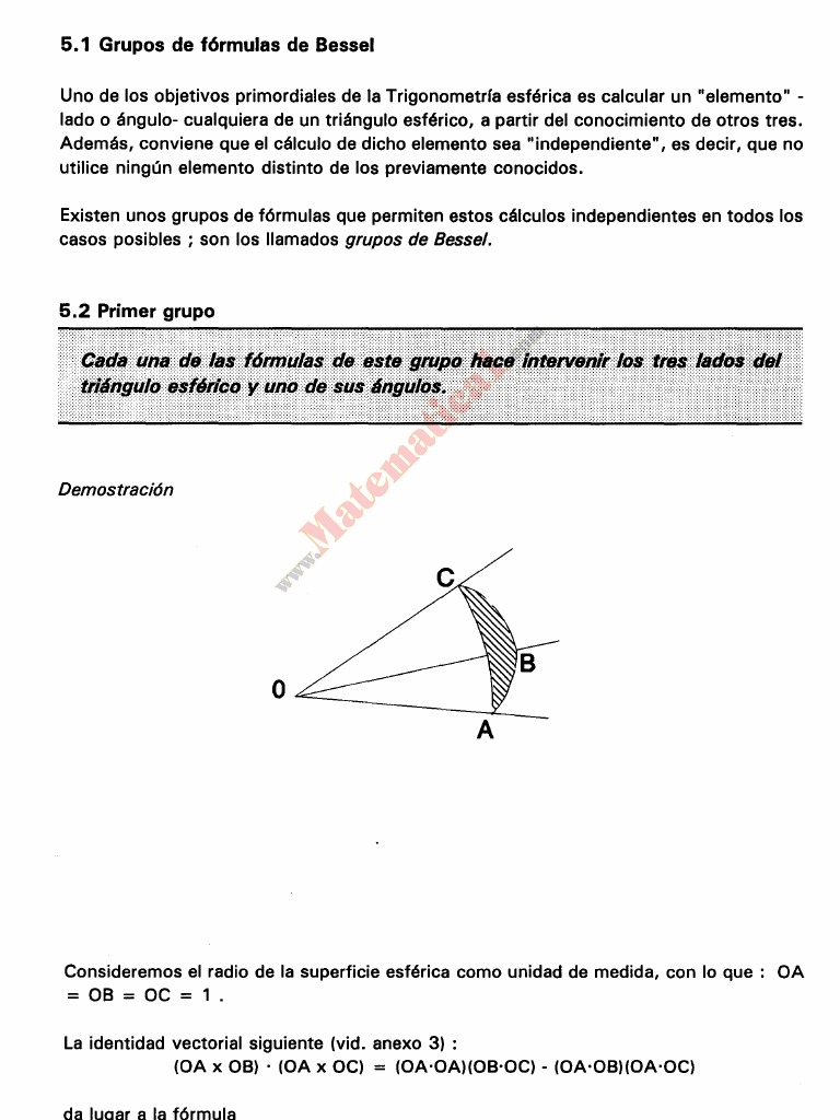 Uno de los objetivos primordiales de la Trigonometrra esfrica es calcular un "elemento" lado o ngulo- cualquiera de un tringulo esfrico, a partir del conocimiento de otros tres. Adems, conviene que el clculo de dicho elemento sea "independiente", es decir, que no utilice ningn elemento distinto de los previamente conocidos. Existen unos grupos de frmulas que permiten estos clculos independientes en todos los casos posibles ; son los llamados grupos de Bessel.