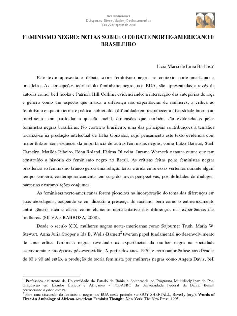 Este texto apresenta o debate sobre feminismo negro no contexto norte-americano e brasileiro. As concepções teóricas do feminismo negro, nos EUA, são apresentadas através de autoras como, bell hooks e Patricia Hill Collins, evidenciando: a intersecção das categorias de raça e gênero como um aspecto que marca a diferença nas experiências de mulheres; a crítica ao feminismo enquanto teoria e prática, sobretudo a dificuldade em reconhecer a diversidade interna ao movimento, em particular a questão racial, dimensões que também são evidenciadas pelas feministas negras brasileiras. No contexto brasileiro, uma das principais contribuições à temática localiza-se na produção intelectual de Lélia Gonzalez, cujo pensamento este texto evidencia com maior ênfase, sem esquecer da importância de outras feministas negras, como Luíza Bairros, Sueli Carneiro, Matilde Ribeiro, Edna Roland, Fátima Oliveira, Jurema Werneck e tantas outras que tem construído a história do feminismo negro no Brasil. As críticas feitas pelas feministas negras brasileiras ao feminismo branco gerou uma relação tensa e árida entre essas vertentes durante algum tempo, embora, contemporaneamente tem surgido novas perspectivas, possibilidades de diálogos, parcerias e mesmo ações conjuntas. As feministas norte-americanas foram pioneiras na incorporação do tema das diferenças em suas abordagens, ocupando-se em discutir a presença do racismo, bem como o entrecruzamento entre gênero, raça e classe como elemento representativo das diferenças nas experiências das mulheres. (SILVA e BARBOSA, 2008). Desde o século XIX, mulheres negras norte-americanas como Sojourner Truth, Maria W. Stewart, Anna Julia Cooper e Ida B. Wells-Barnett 2 tiveram papel fundamental no desenvolvimento de uma crítica feminista negra, revelando as experiências da mulher negra na sociedade escravocrata e nas épocas pós-escravidão. A partir dos anos 1970, e com maior ênfase nas décadas de 80 e 90 até então, a produção de teoria feminista por mulheres negras como Angela Davis, bell