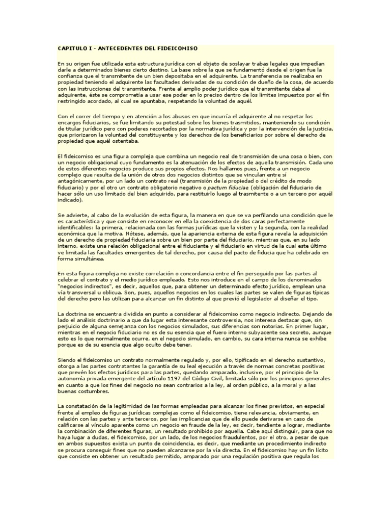 A. PERFIL NORMATIVO DEL FIDEICOMISO COMN U ORDINARIO 1. Concepto El fideicomiso es el negocio mediante el cual una persona trasmite la propiedad de ciertos bienes con el objeto de que sean destinados a cumplir un fin determinado. En esta conceptualizacin genrica se destacan dos aspectos claramente definidos. Uno, la transferencia de la propiedad del bien; otro, un mandato en confianza. El fideicomiso no constituye un fin en si mismo, sino, en verdad, un vehculo apto para dotar de mayor seguridad jurdica a un determinado negocio. El adquirente es el receptor de ciertos bienes, los que se mantienen separados del patrimonio de los dems sujetos que participan en el negocio y del suyo propio. La propiedad que aqul ostenta desde el punto de vista jurdico carece de contenido econmico, pues ste le pertenece al beneficiario o bien al fideicomisario, que puede ser el propio transmitente (fiduciante). La discusin acerca de su naturaleza unilateral o bilateral ha sido resuelta por la ley 24.441 al definir al fideicomiso celebrado entre vivos como un contrato (arts. 2 y 4) y al fideicomiso testamentario como un acto jurdico unilateral de ltima voluntad sin que la no aceptacin de su nombramiento por parte del fiduciario afecte el nacimiento del fideicomiso (art. 3). De acuerdo con la Ley el Fideicomiso puede constituirse por dos medios: el contrato y el testamento. La ley se apoya bsicamente en el contrato, hasta el extremo de que al dar su concepto, lo limita a l. Debi referirse "stricto-sensu", al "acto jurdico", comprensivo as de ambas especies. Dice el art. 1: "Habr fideicomiso cuando una persona (fiduciante) transmita la propiedad fiduciaria de bienes determinados a otra (fiduciario), quien se obliga a ejercerla en beneficio de quien se designe en el contrato (beneficiario), y a transmitirlo al cumplimiento de un plazo o condicin al fiduciante, al beneficiario o al fideicomisario". Lo que hace el texto es proporcionar el concepto de un fideicomiso ya constituido, pues se trata de un contrato consensual y no real, por lo que debi decir que el fiduciante "se obliga a transmitir" (no "transmita", que supone una transferencia efectuada). Por otra parte, en el final donde dice: "... y a transmitirlo...", debi expresar: "... y a transmitirla...", pues est aludiendo a la "propiedad fiduciaria", que es de gnero