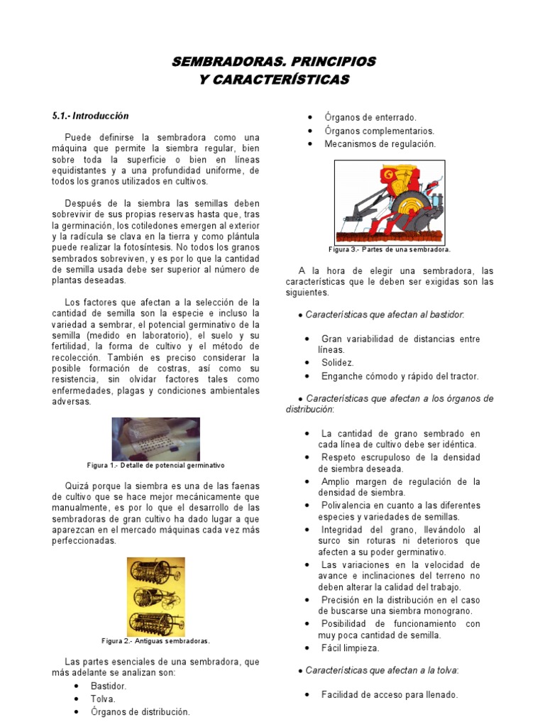 5.1.- Introduccin Puede definirse la sembradora como una mquina que permite la siembra regular, bien sobre toda la superficie o bien en lneas equidistantes y a una profundidad uniforme, de todos los granos utilizados en cultivos. Despus de la siembra las semillas deben sobrevivir de sus propias reservas hasta que, tras la germinacin, los cotiledones emergen al exterior y la radcula se clava en la tierra y como plntula puede realizar la fotosntesis. No todos los granos sembrados sobreviven, y es por lo que la cantidad de semilla usada debe ser superior al nmero de plantas deseadas. Los factores que afectan a la seleccin de la cantidad de semilla son la especie e incluso la variedad a sembrar, el potencial germinativo de la semilla (medido en laboratorio), el suelo y su fertilidad, la forma de cultivo y el mtodo de recoleccin. Tambin es preciso considerar la posible formacin de costras, as como su resistencia, sin olvidar factores tales como enfermedades, plagas y condiciones ambientales adversas.