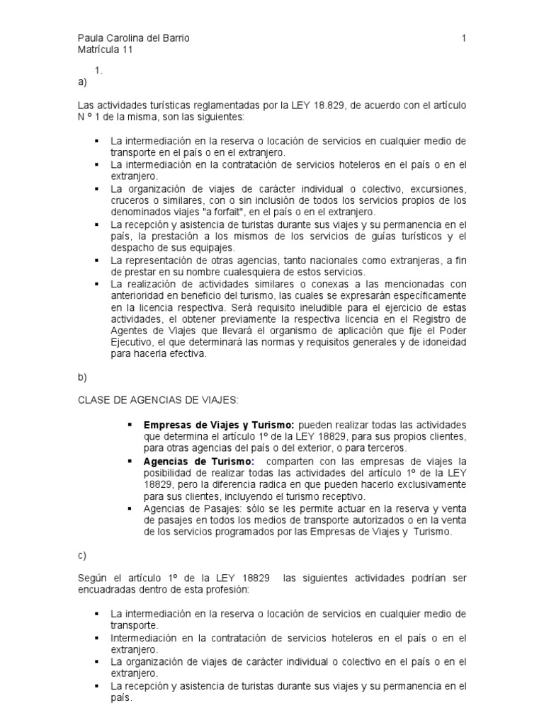 Las actividades tursticas reglamentadas por la LEY 18.829, de acuerdo con el artculo N 1 de la misma, son las siguientes: La intermediacin en la reserva o locacin de servicios en cualquier medio de transporte en el pas o en el extranjero. La intermediacin en la contratacin de servicios hoteleros en el pas o en el extranjero. La organizacin de viajes de carcter individual o colectivo, excursiones, cruceros o similares, con o sin inclusin de todos los servicios propios de los denominados viajes "a forfait", en el pas o en el extranjero. La recepcin y asistencia de turistas durante sus viajes y su permanencia en el pas, la prestacin a los mismos de los servicios de guas tursticos y el despacho de sus equipajes. La representacin de otras agencias, tanto nacionales como extranjeras, a fin de prestar en su nombre cualesquiera de estos servicios. La realizacin de actividades similares o conexas a las mencionadas con anterioridad en beneficio del turismo, las cuales se expresarn especficamente en la licencia respectiva. Ser requisito ineludible para el ejercicio de estas actividades, el obtener previamente la respectiva licencia en el Registro de Agentes de Viajes que llevar el organismo de aplicacin que fije el Poder Ejecutivo, el que determinar las normas y requisitos generales y de idoneidad para hacerla efectiva.