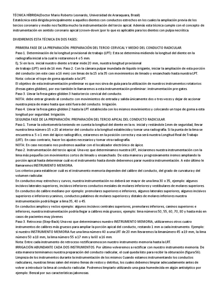 conductos estrechos en los cuales la ampliacin previa de los tercios coronario y medio nos facilita mucho la instrumentacin del tercio apical. Adems esta tcnica cumple con el concepto de instrumentacin en sentido coronario apical (crown-down )por lo que es aplicable para los dientes con pulpa necrtica. DIVIDIREMOS ESTA TCNICA EN DOS FASES: PRIMERA FASE DE LA PREPARACIN: PREPARACIN DEL TERCIO CERVICAL Y MEDIO DEL CONDUCTO RADICULAR. Paso 1. Determinacin de la longitud provisional de trabajo (LPT): Esta se determina midiendo la longitud del diente en la radiografa inicial a la cual le restaremos 4 o 5 mm. Ej. Si en la rx. inicial nuestro diente a tratar mide 20 mm, nuestra longitud provisional de trabajo (LPT) ser de 16 mm. Paso 2. Con la cmara pulpar inundada de lquido irrigante, iniciar la ampliacin de esta porcin del conducto (en este caso a 16 mm) con limas de la 15 a la 35 con movimientos de limado y ensanchado hasta nuestra LPT. Nota: colocar el tope de goma ajustado a la LPT. El objetivo de esta instrumentacin preliminar es que nos sirva de gua para la utilizacin de nuestros instrumentos rotatorios (fresas gates glidden), por eso tambin le llamaremos a esta instrumentacin preliminar: instrumentacin pre-gates. Paso 3. Llevar la fresa gates-glidden 3 hasta tercio cervical del conducto. NOTA: debe entrar girando al conducto con movimientos de entrada y salida nicamente dos o tres veces y dejar de accionar nuestra pieza de mano hasta que est fuera del conducto. Irrigacin. Paso 4. Llevar la fresa gates-glidden 2 hasta la LPT establecida con los mismos movimientos y colocando un tope de goma a esta longitud por seguridad. Irrigacin. SEGUNDA FASE DE LA PREPARACIN: PREPARACIN DEL TERCIO APICAL DEL CONDUCTO RADICULAR. Paso 1. Tomar la odontometra teniendo en cuenta la longitud del diente en la rx. inicial y restndole 1mm de seguridad, llevar nuestra lima nmero 15 o 20 al interior del conducto a la longitud establecida y tomar una radiografa. Si la punta de la lima se encuentra a .5 o 1 mm del pice radiogrfico, estaremos en la posicin correcta y esa ser nuestra Longitud Real de Trabajo (LRT). En caso contrario, hacer los ajustes necesarios y tomar otra radiografa. NOTA: En caso necesario nos podremos auxiliar con el localizador electrnico de pice. Paso 2. Instrumentacin del tercio apical. Una vez que determinamos nuestra LRT, iniciaremos nuestra instrumentacin con la lima ms pequea con movimientos cortos de limado y ensanchado. De esta manera y progresivamente iremos ampliando la porcin apical hasta determinar cul es el instrumento hasta donde deberemos parar nuestra instrumentacin. A este ltimo le llamaremos INSTRUMENTO MEMORIA. Los criterios para establecer cul es el instrumento memoria dependen del calibre del conducto, del grado de curvatura y del volumen radicular. En conductos muy estrechos y curvos, nuestra instrumentacin no deber ser mayor de una lima 30 o 35, ejemplo: algunos incisivos laterales superiores, incisivos inferiores conductos mesiales de molares inferiores y vestibulares de molares superiores. En conductos de calibre mediano por ejemplo: premolares superiores e inferiores, algunos laterales superiores, algunos incisivos superiores e inferiores ycaninos, conductos palatinos de molares superiores y distales de molares inferiores nuestra instrumentacin podr llegar a lima 35, 40 o 45. En conductos amplios y rectos ejemplo: algunos incisivos centrales superiores, premolares inferiores, caninos superiores e inferiores, nuestra instrumentacin podra llegar a calibres ms gruesos, ejemplo: lima nmeros 50, 55, 60, 70, 80 y hasta ms en casos de pacientes muy jvenes. Paso 3. Retroceso (Step-Back) Una vez que determinamos nuestro INSTRUMENTO MEMORIA, utilizaremos otros cuatro instrumentos de calibres ms gruesos para ampliar la porcin apical del conducto, restando 1 mm a cada instrumento. Ejemplo: si nuestro INSTRUMENTO MEMORIA fue una lima nmero 40 a una LRT de 20 mm llevaremos la limanmero 45 a 19 mm, la lima nmero 50 a 18 mm, la lima nmero 55 a 17 mm y la 60 a 16 mm. Nota: Entre cada instrumento de retroceso rectificaremoscon nuestro instrumento memoria hasta la LRT. IRRIGACIN ABUNDANTE CADA DOS INSTRUMENTOS. Por ltimo volveremos a rectificar con nuestro instrumento memoria. De esta manera terminamos nuestra preparacin del conducto radicular, el cual queda listo para recibir la obturacin (figura 56). Limpieza de los instrumentos durante la instrumentacin de los mismos Cuando estamos instrumentando los conductos radiculares, nuestras limas salen del mismo llenas de restos y detritus, los cuales debemos limpiar adecuadamente antes de volver a introducir la lima al conducto radicular. Podremos limpiarlo utilizando una gasa humedecida en algn antisptico por ejemplo: Benzal por sus caractersticas jabonosas.